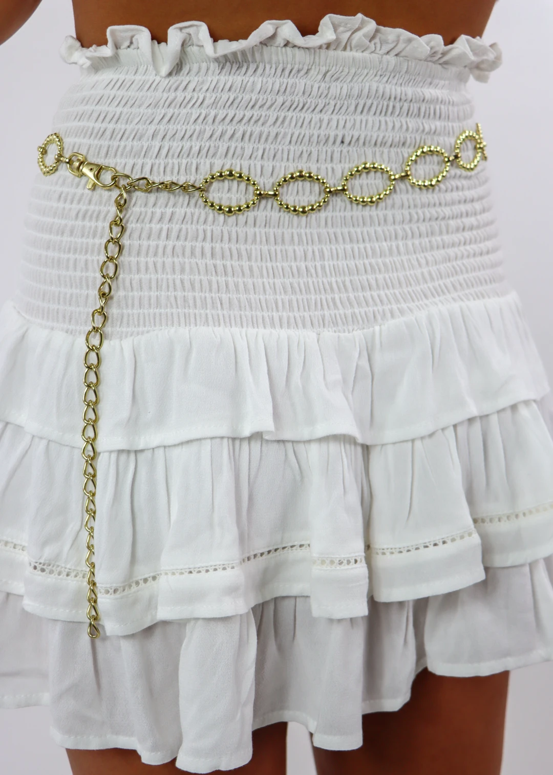 We are obsessed with this gold beaded oval ring belt! It is the perfect piece to spice up any outfit. Pair it with a pair of jeans or a skirt for the ultimate cutest outfit. We know you will rock it!