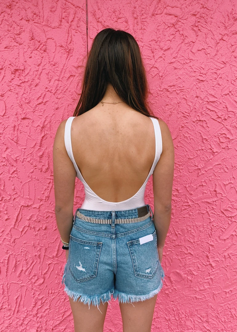 This low-back white tank style bodysuit is the perfect basic to pair with any outfit. With a scoop neck and lovely low back, throw on this bodysuit with your favorite jeans for an easy and put-together look.