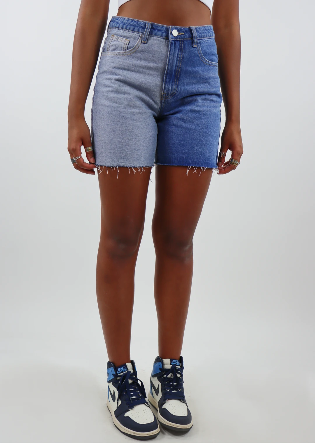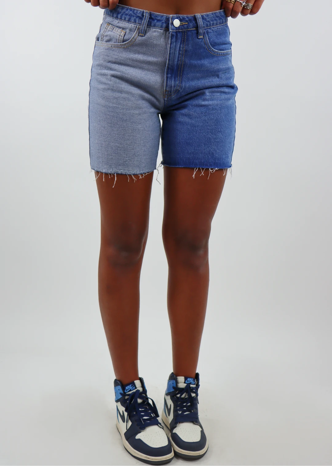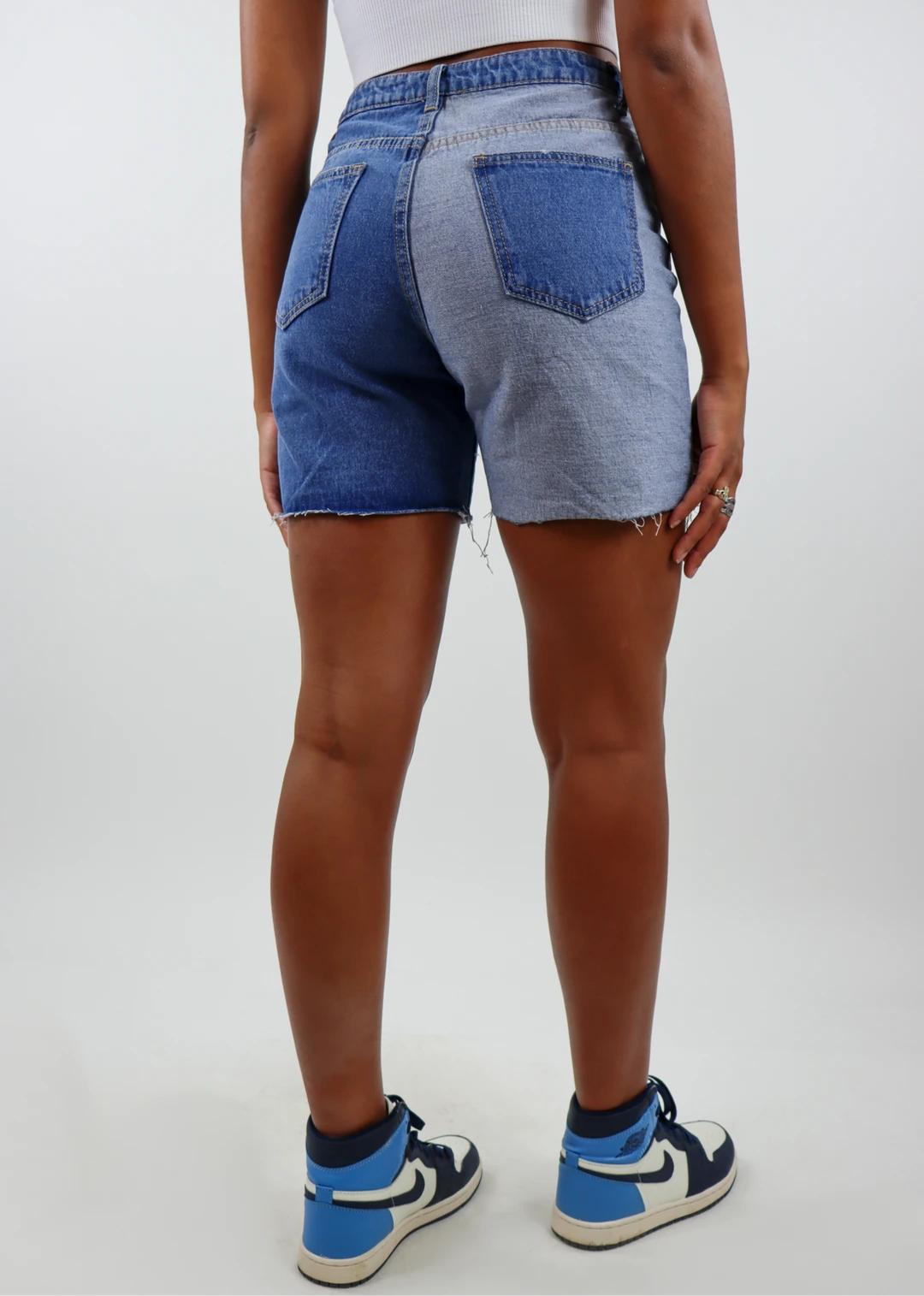 These two-toned jean shorts are an absolute must for you! They will no doubt have you be looking on point when you wear them! These jean shorts have a longer fit with light wash on the right leg and medium wash on the left. Both pockets on the back have a medium wash as well as the waistband.