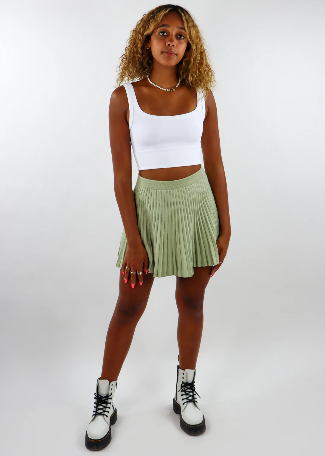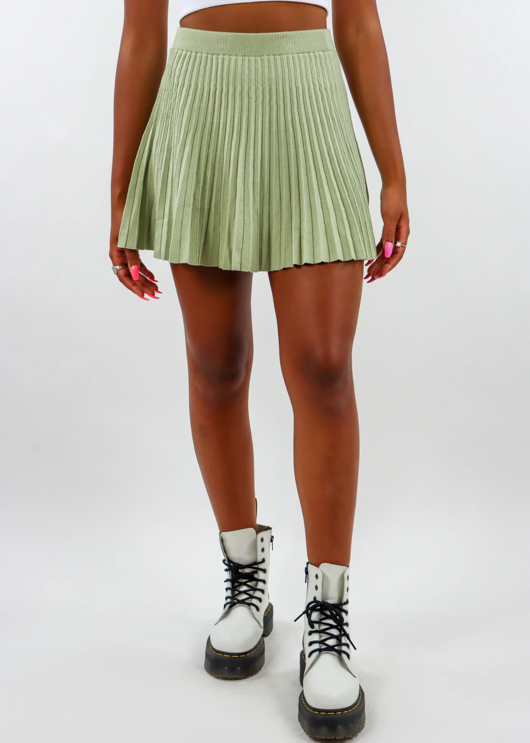 Stay on top of the latest trends with this pistachio knit tennis skirt. It features an elastic waistband and pleated material throughout. It is the perfect piece to wear casually for a day time look or dress up for a night on the town.