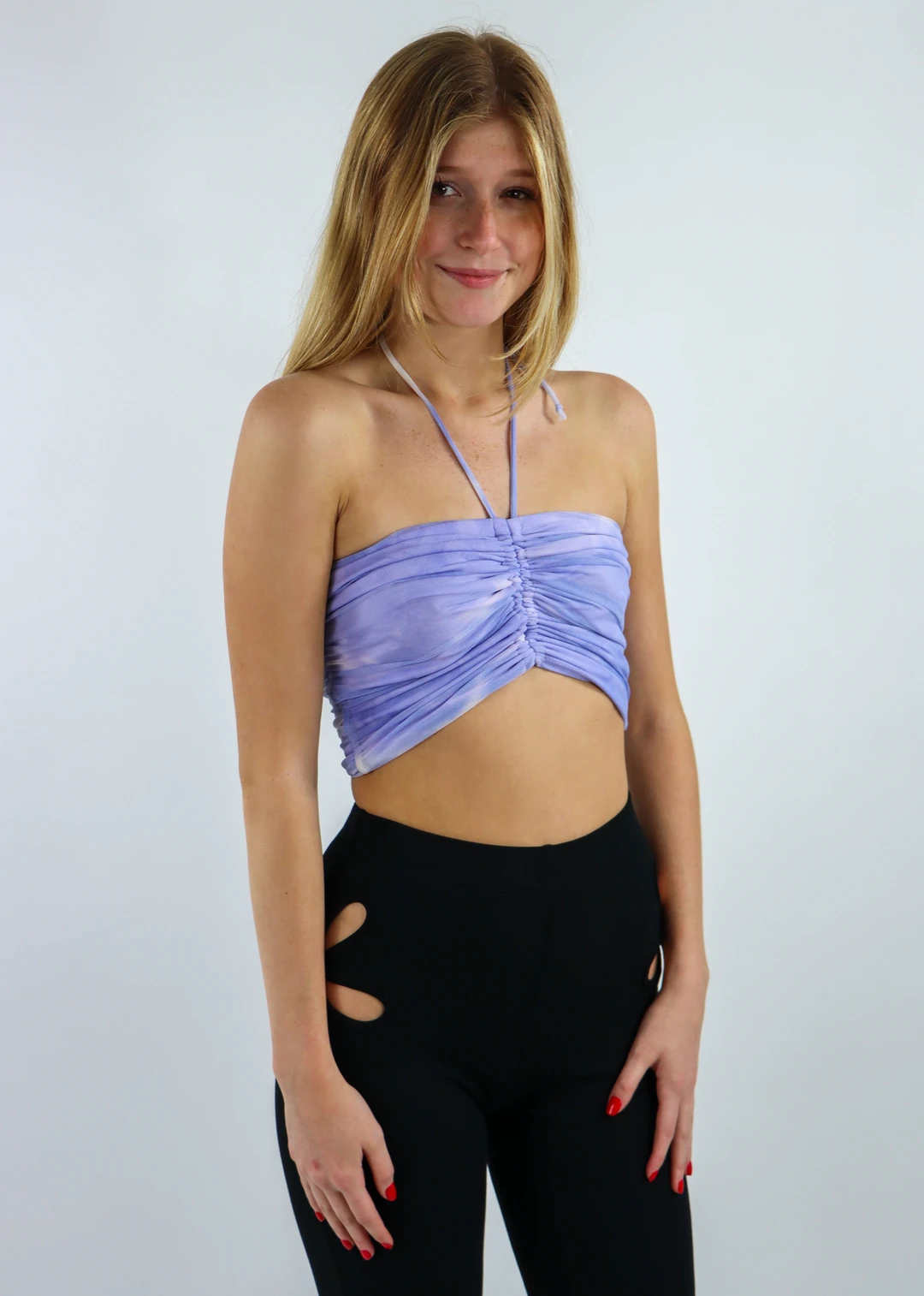 You are going to love this versatile crop top! It features a mesh material and ruched front with straps that can be worn in two different ways. You can tie the straps around your neck for a halter style top, or tie them in the front for a cute tube top. Pair this top with one of our best selling Sunshine Daydream skirts for a flirty daytime look.