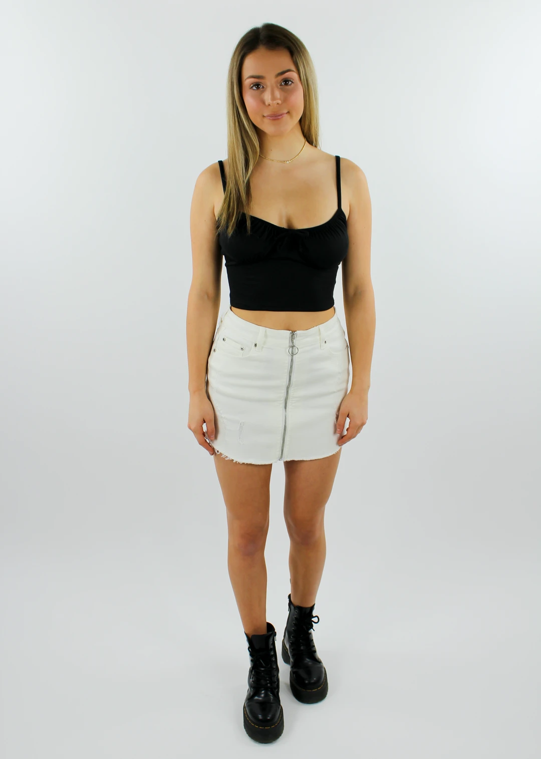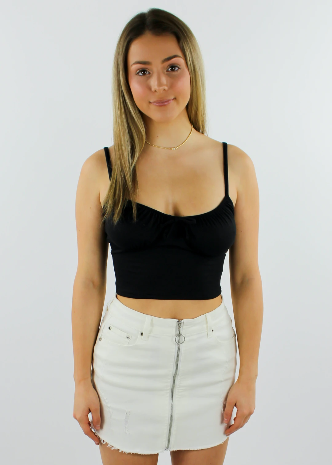 This bustier-like crop top with flattering ruching in the chest area is the perfect closet essential for summer. It also features a cute bow in the middle that gives it that perfectly girly edge. Pair it with your favorite skirt or shorts and you’ll be set!