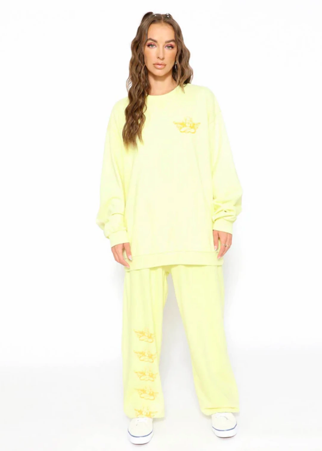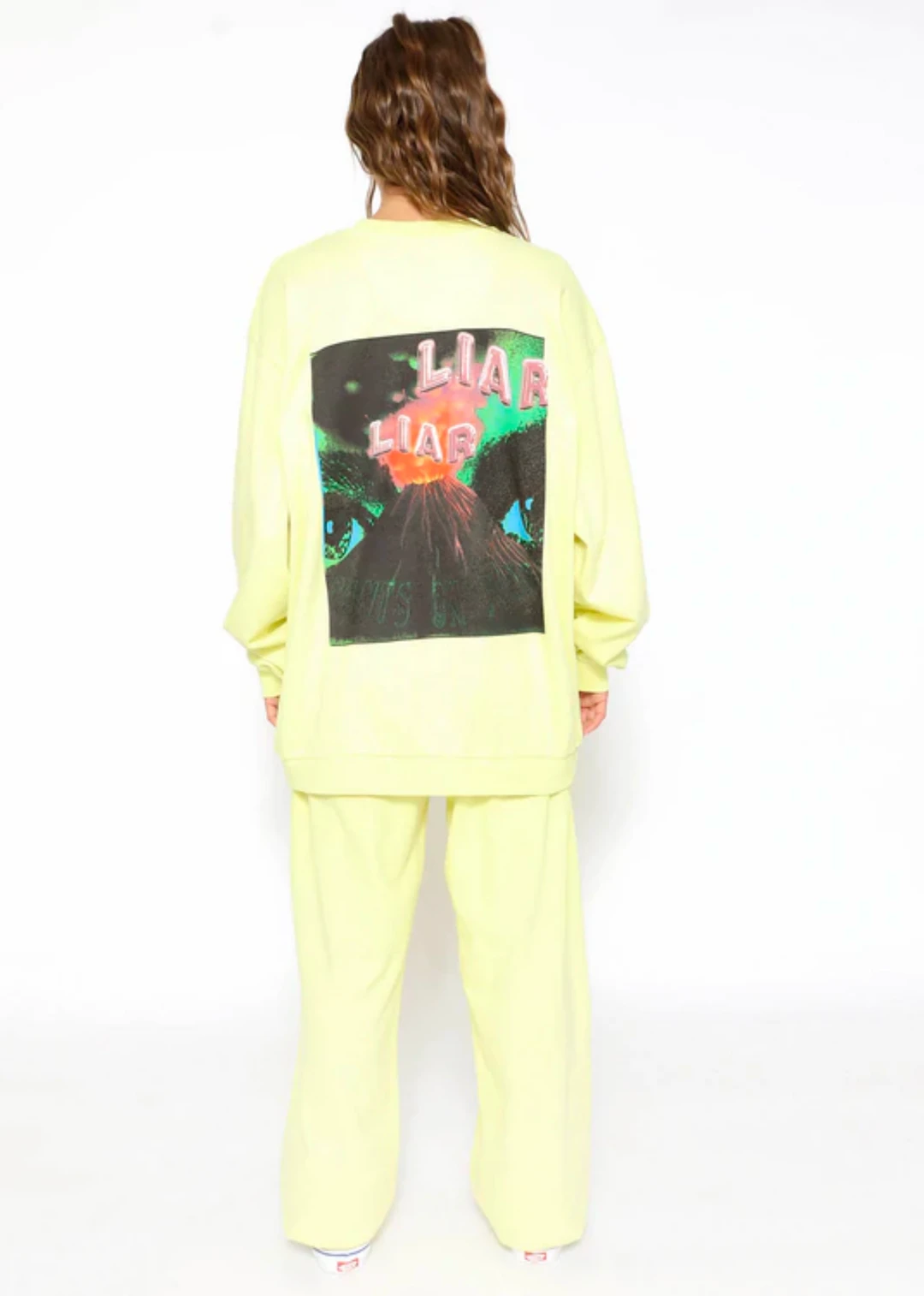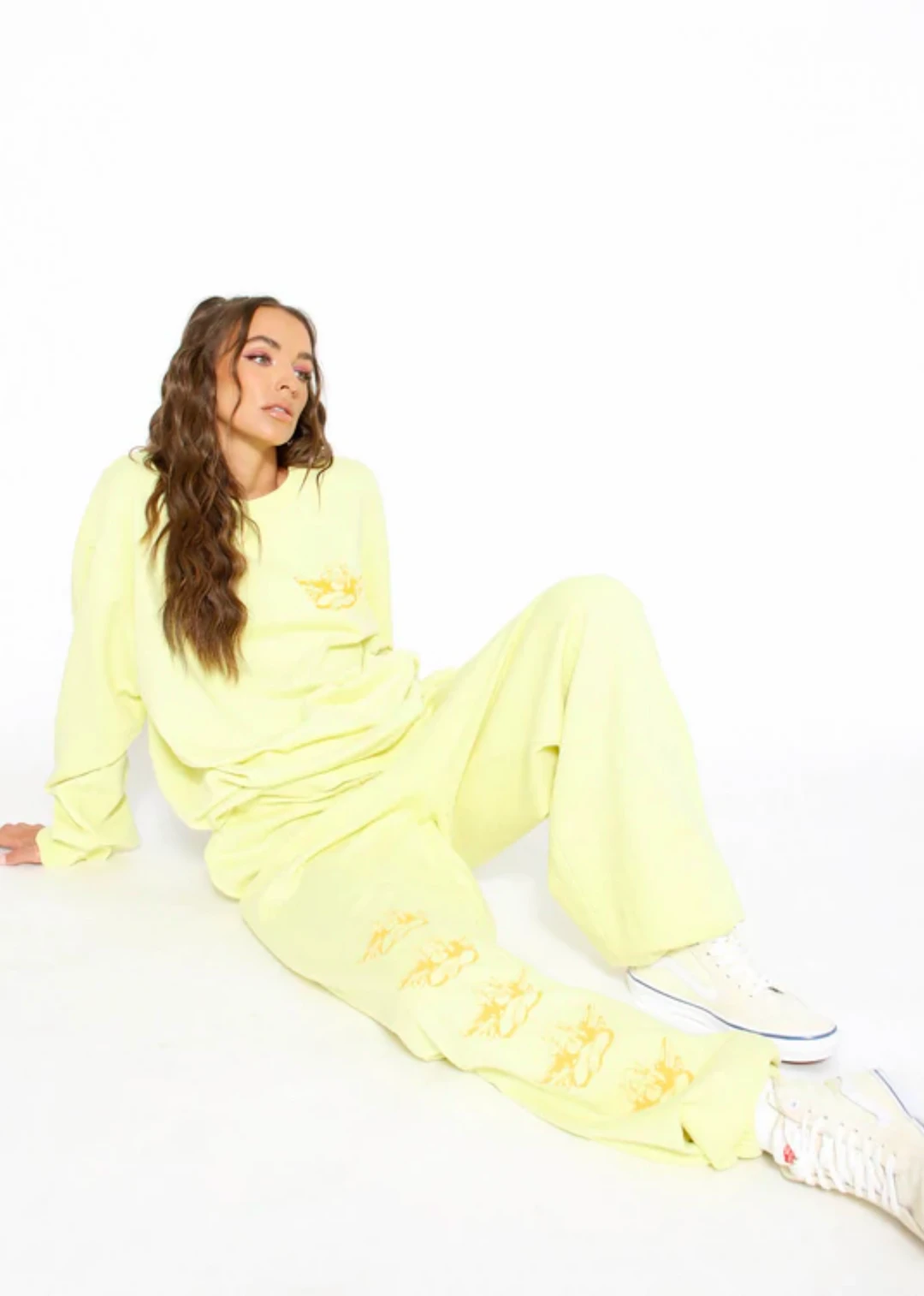 Liar liar pants on fire! These light yellow lightweight fleece sweatpants feature oversized high rise fit with back and side pockets, elastic waistband and cuffs. They also feature the Boys Lie logo all down the front right leg. They are so comfortable and cute, we know these will be your next favorite sweatpants!