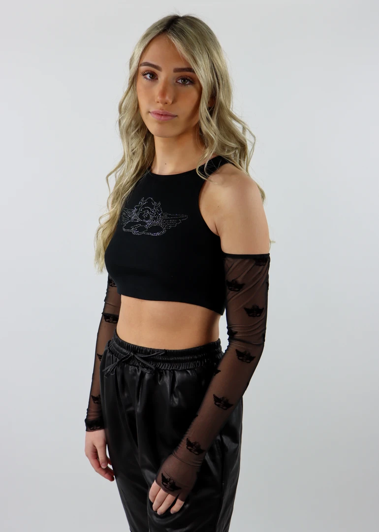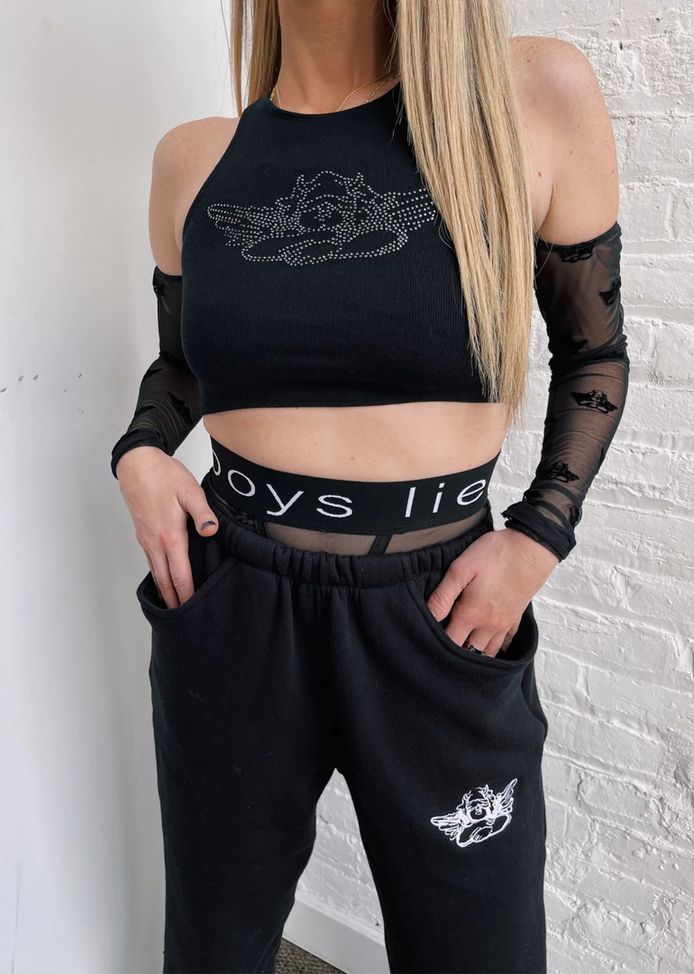 As Boys Lie says, “the only top you’ll want to throw on when you might run into an ex”. We are loving this edgy top, its the perfect top to add to your boys lie collection! This stretch knit racer tank features custom Boys lie flocked logo mesh sleeves and a rhinestone logo motif detail.