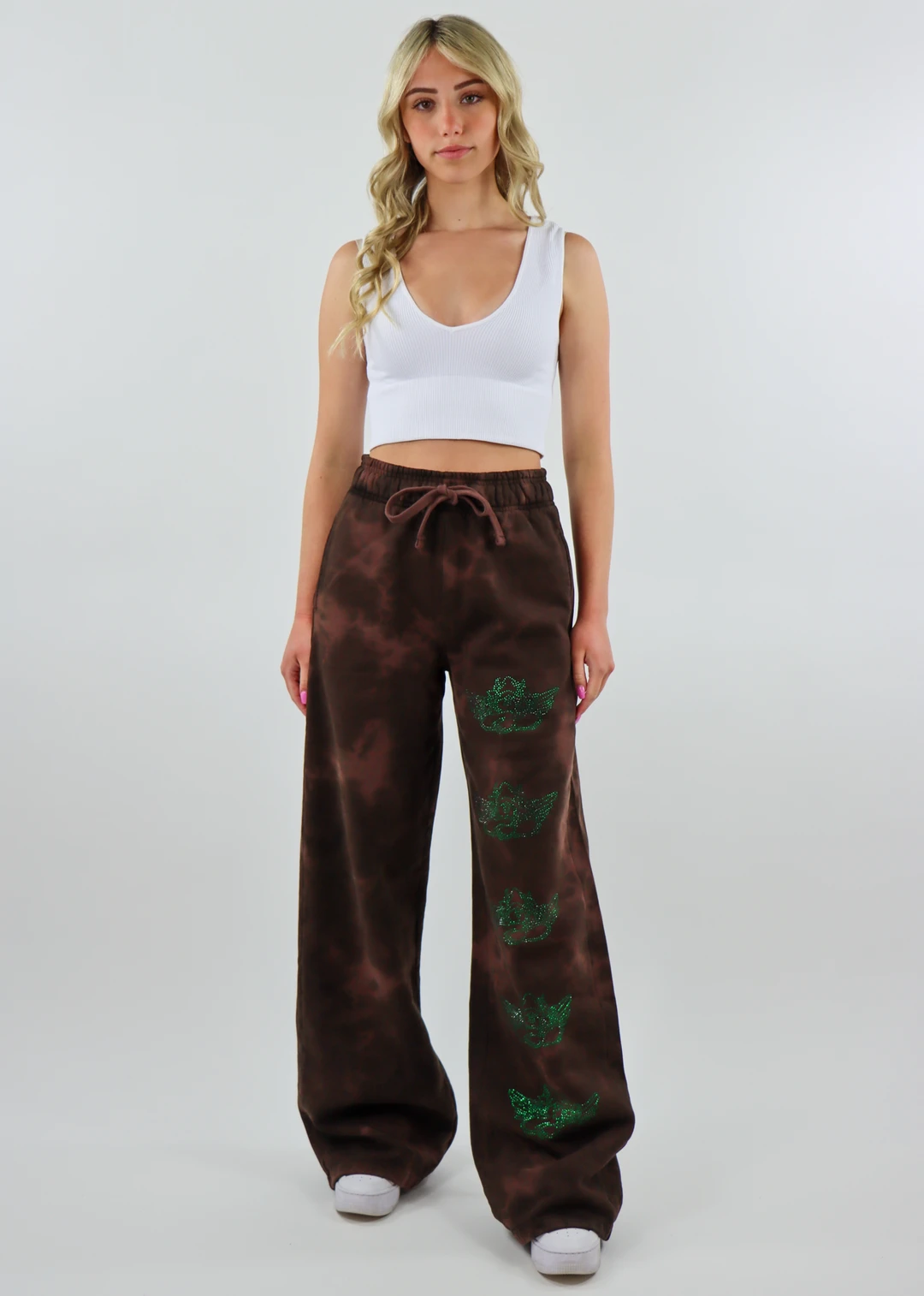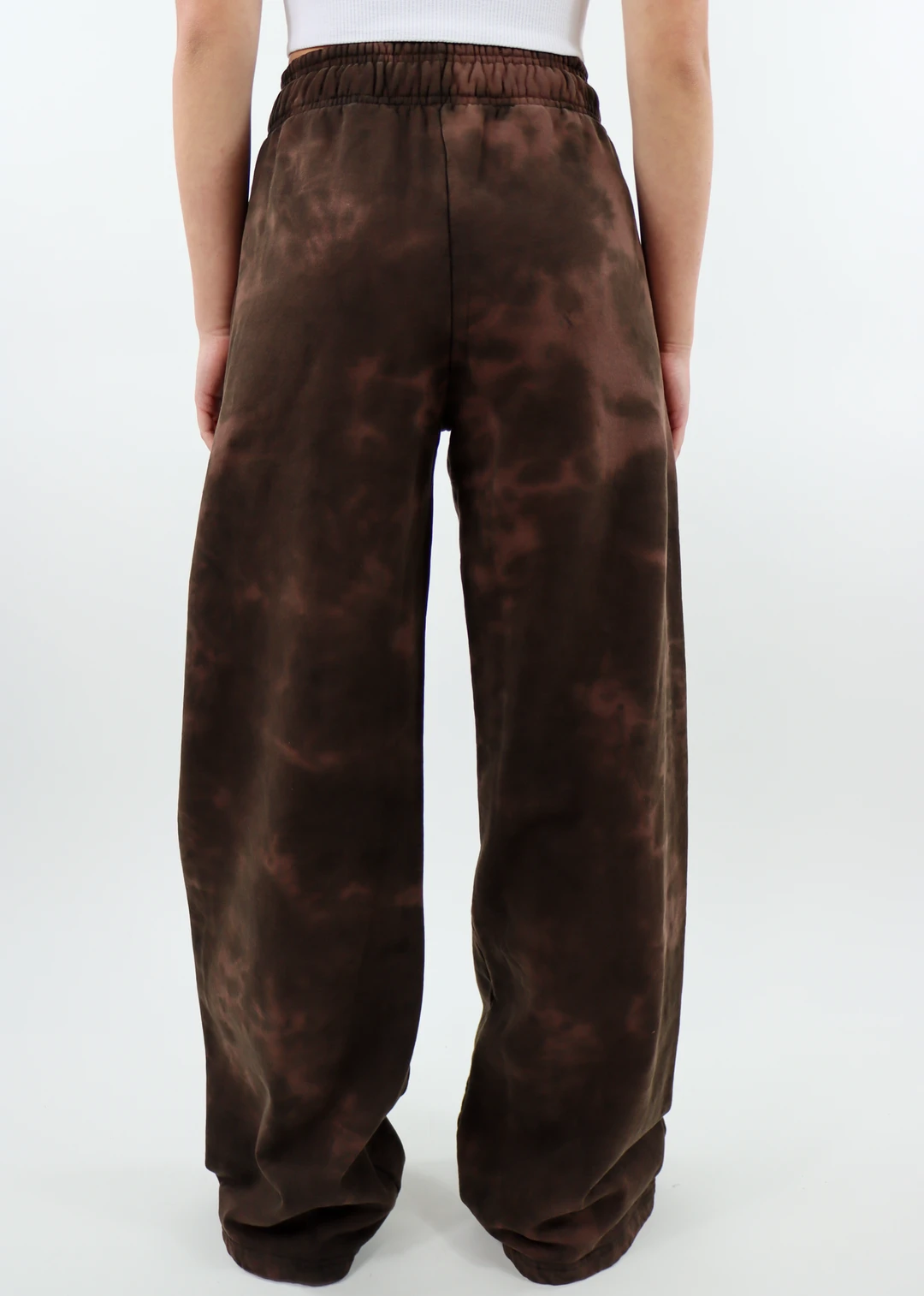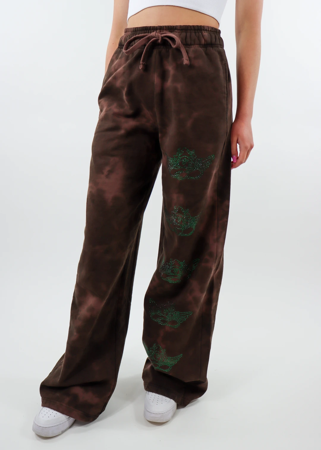 These brown tie-dye sweatpants are the perfect comfy yet edgy piece to add to your streetwear collection. They feature multiple green embroidered Boys lie symbols running down the front of the left pant leg and a wide leg style.