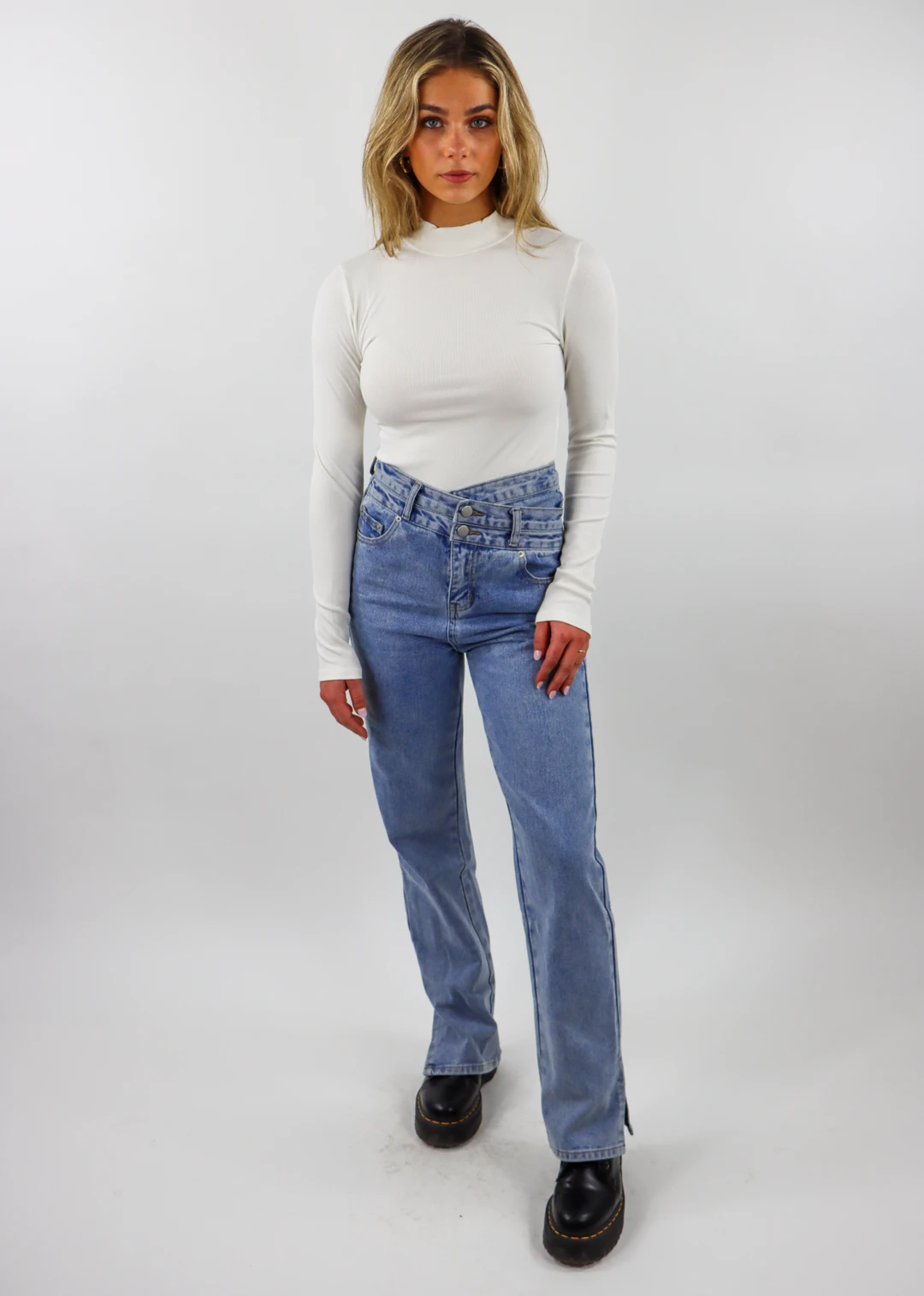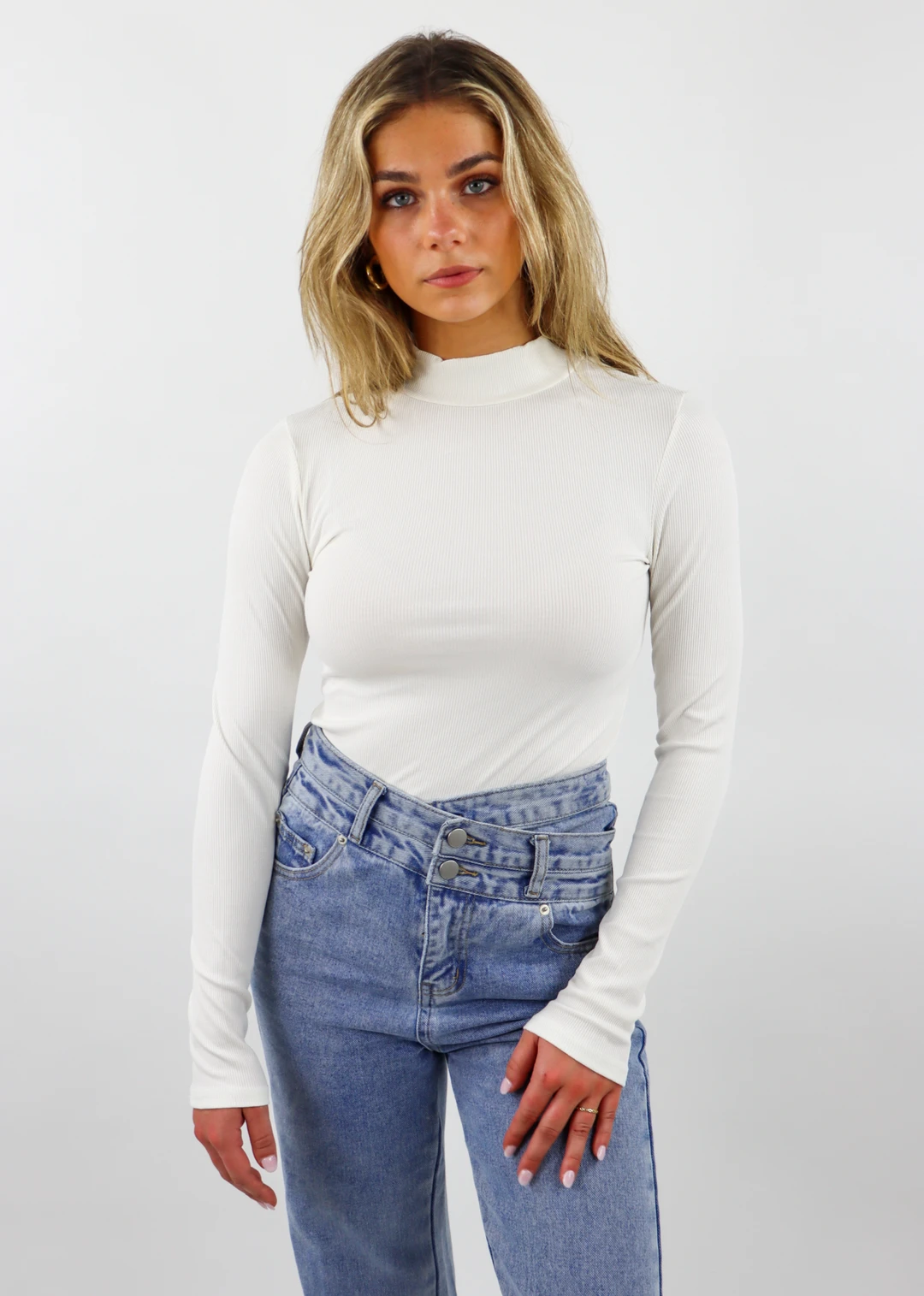 You can never go wrong with a white staple top. It features a mock neckline and ribbed detailing. This is the perfect top to dress up with leather pants or wear casually with your favorite joggers. We know this will be your go-to this season.