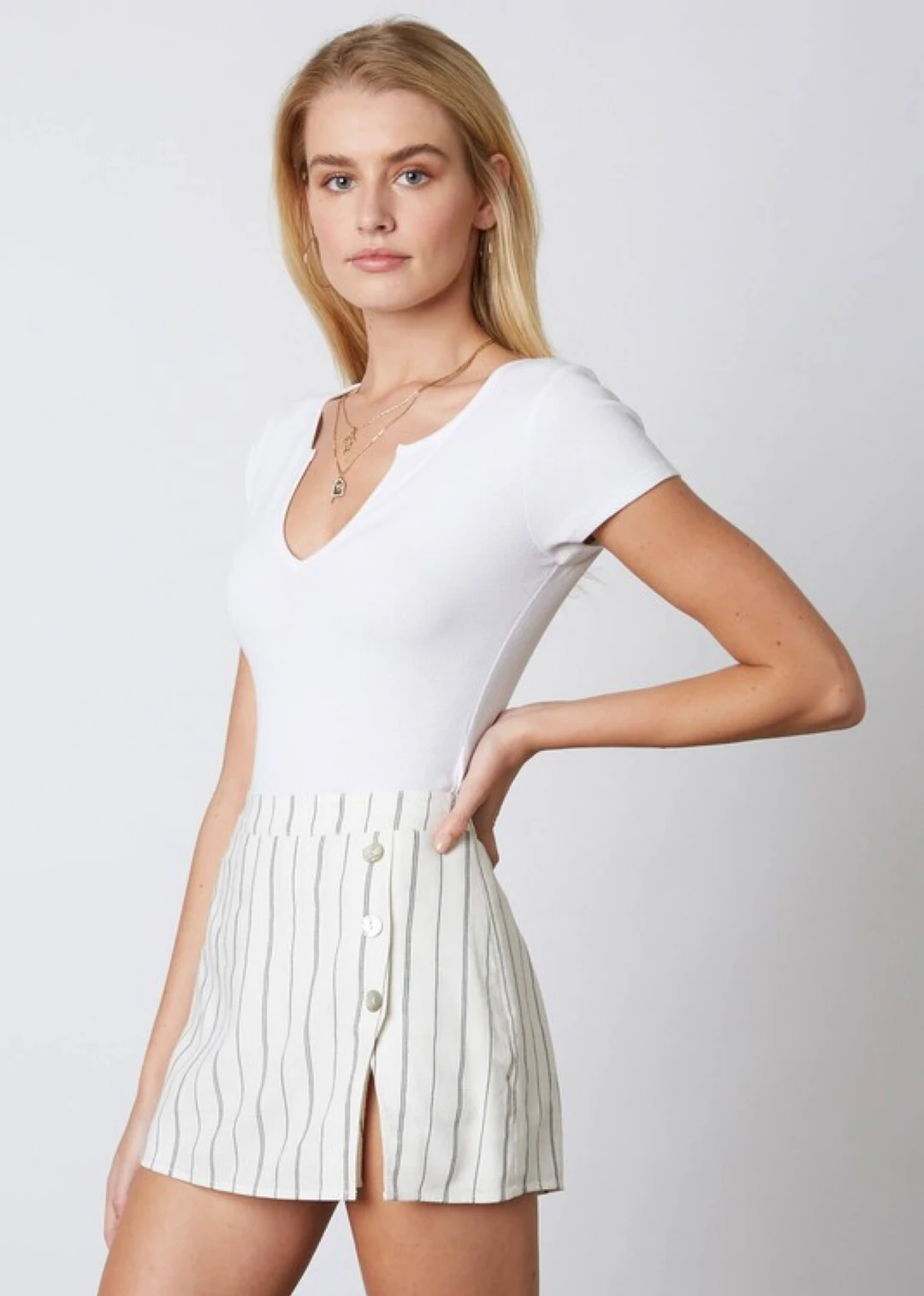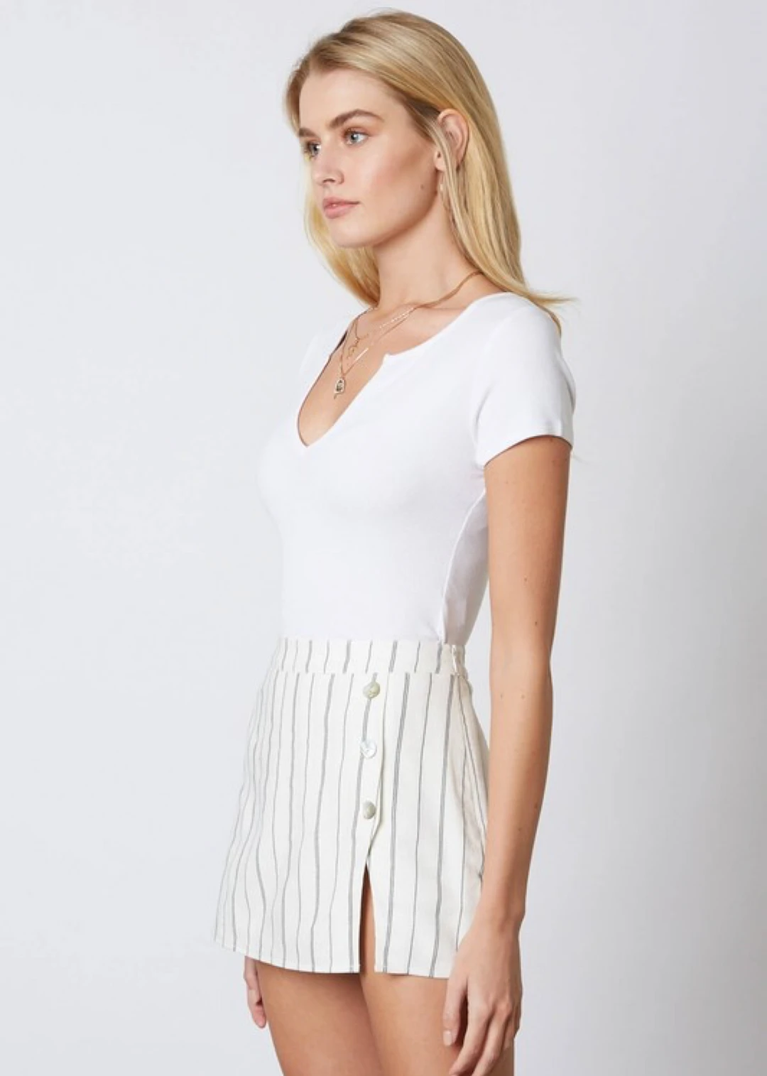 This skort is a perfect addition to your upcoming spring wardrobe. This white skort with a front faced skirt provides style and comfort. The skort features vertical stripes as well as buttons up with a slit on the left leg.