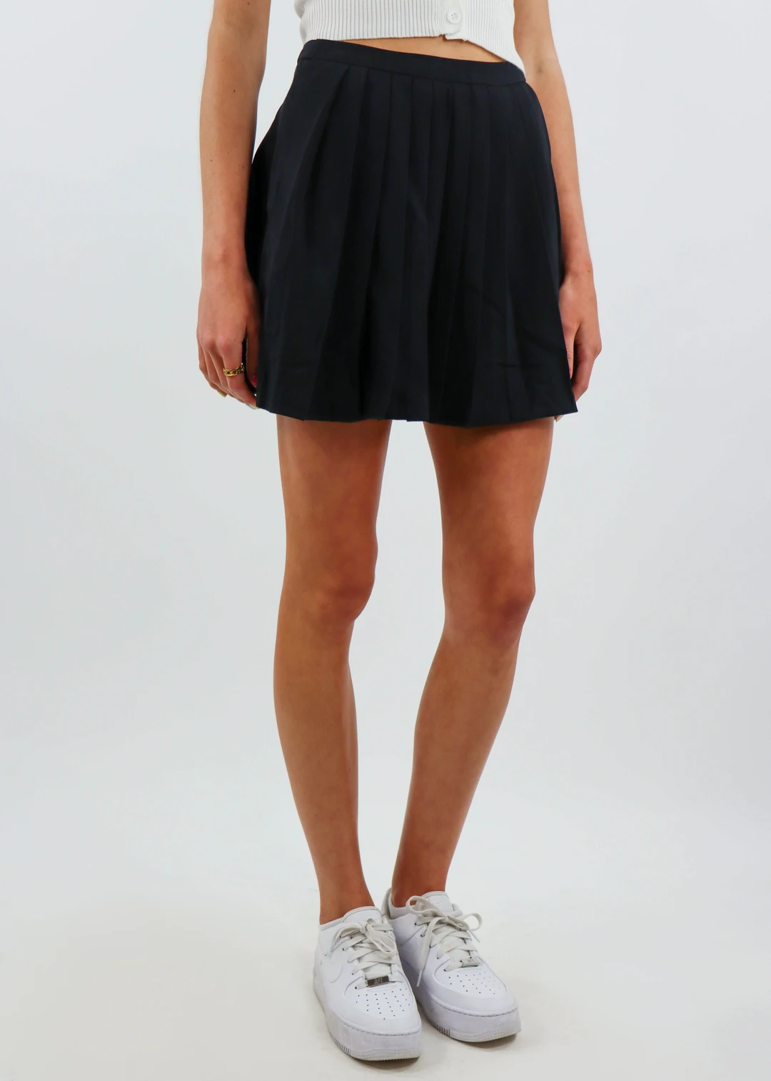 This black tennis skirt is the perfect addition to any closet. This skirt features pleating throughout the body and an invisible zipper on the side. Style this skirt with your favorite collared crewneck and a pair of tennis shoes.