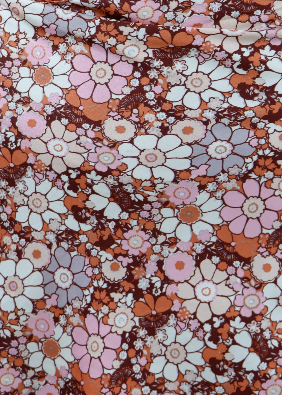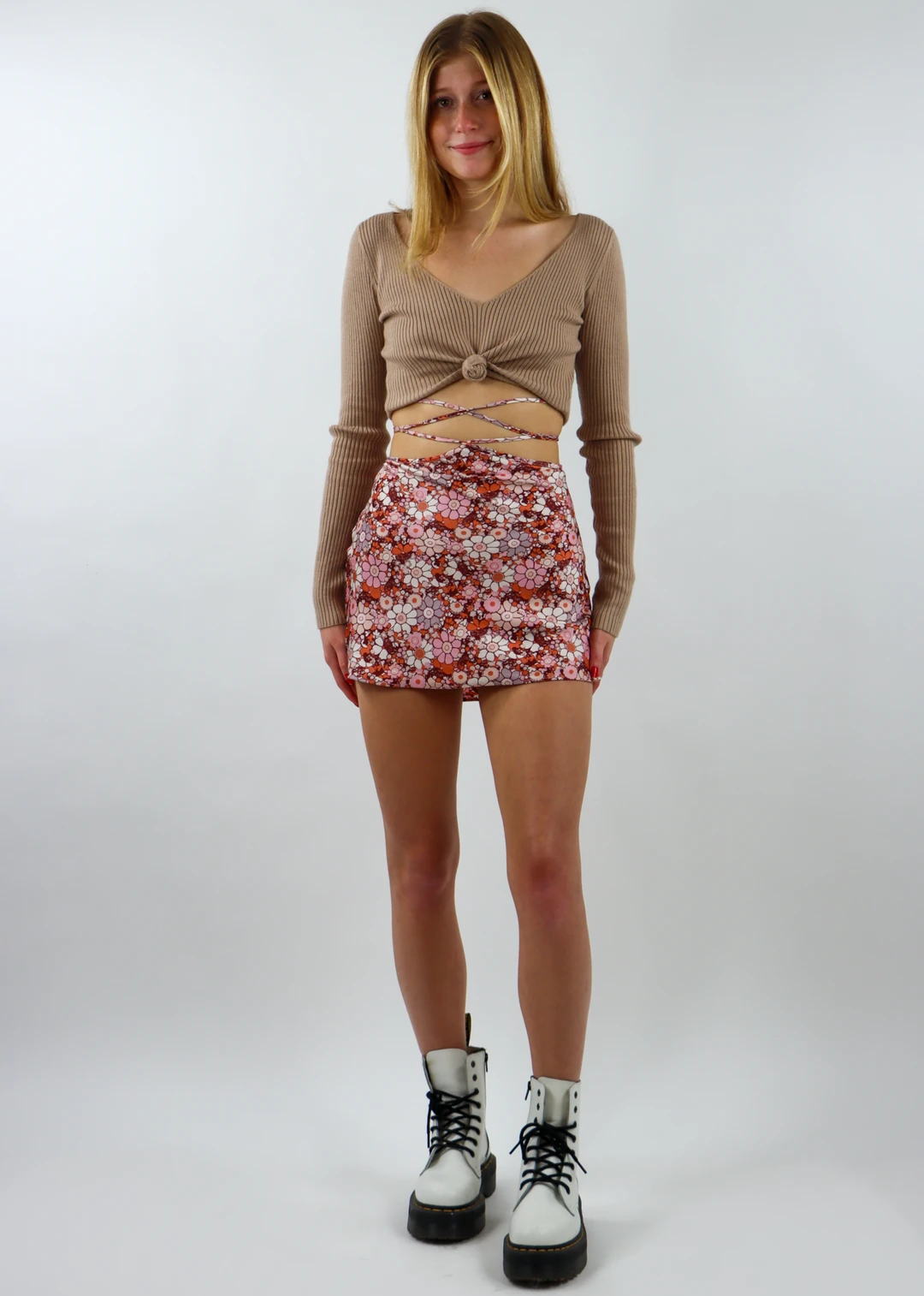 We are obsessed with this 70s style floral wrap skirt! It features a drawstring to wrap around your waist to add some dimension. Pair it with its matching top and some knee high boots for that 70s look. We know you’ll be grooving around in this skirt!