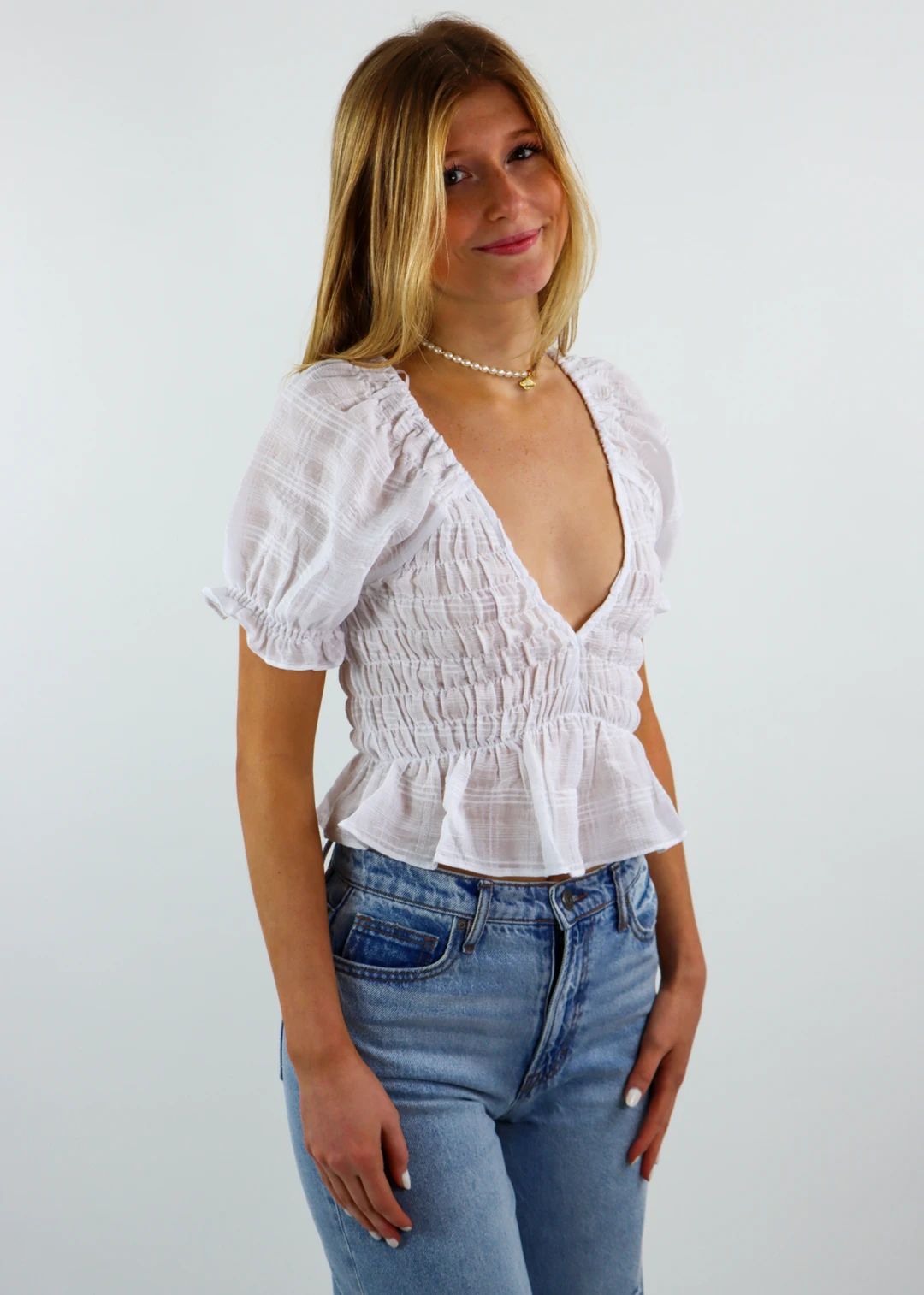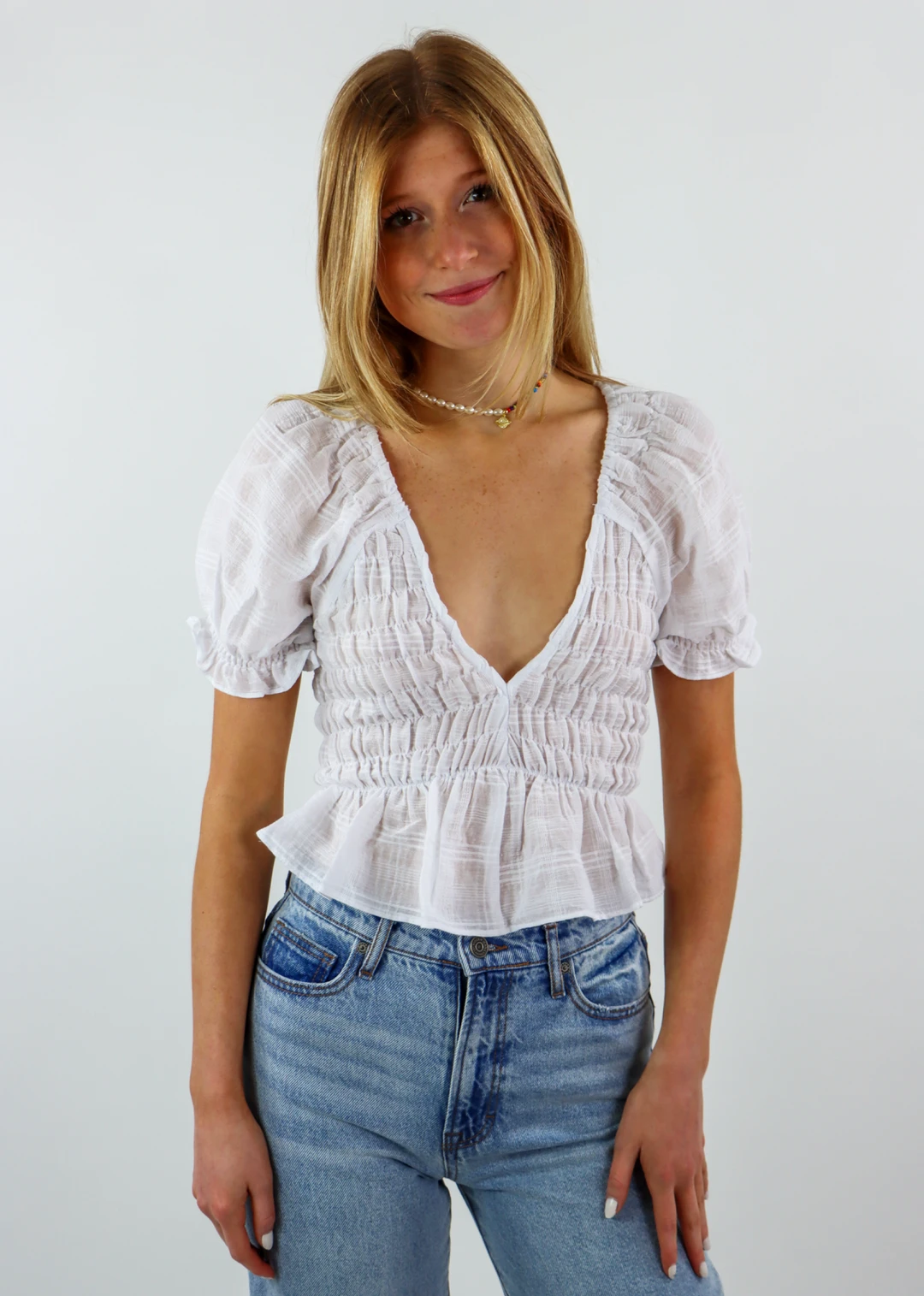 This is the cutest white top and it is the perfect closet essential! It features puff sleeves and a smocked body that is so flattering and comfortable it will become your next go-to top! This top is so versatile you can wear this class to dinner or to school. Pair it with a pair of boyfriend jeans and sneakers to complete the look!