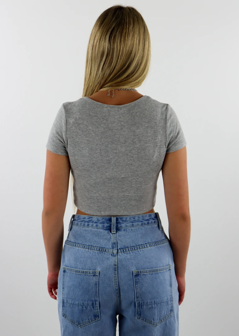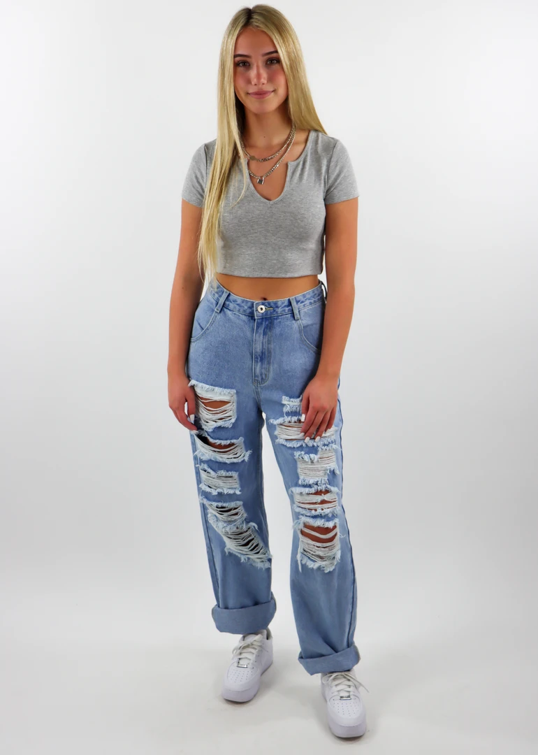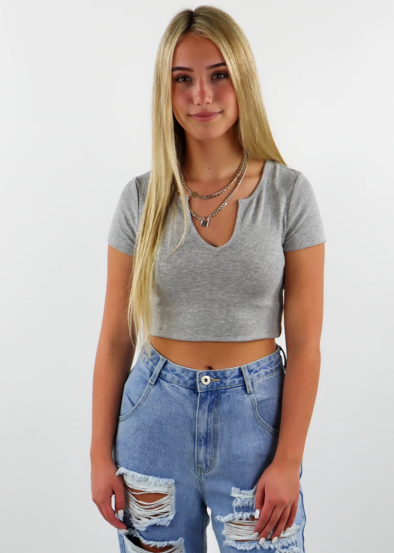 This is the perfect closet essential. It really can go with any bottom in your closet! This slightly cropped shirt features ribbed material that is so flattering and a notch neck.