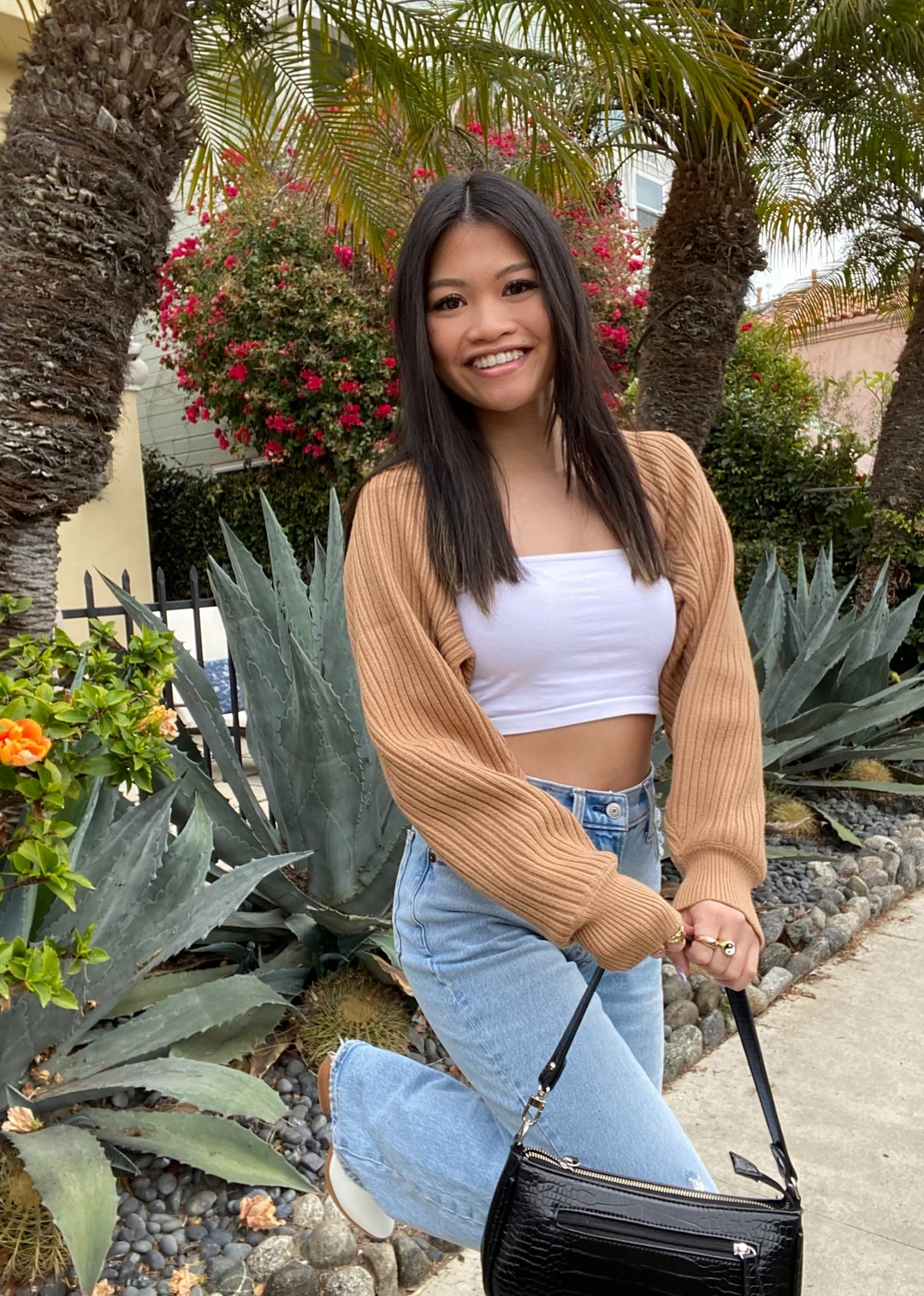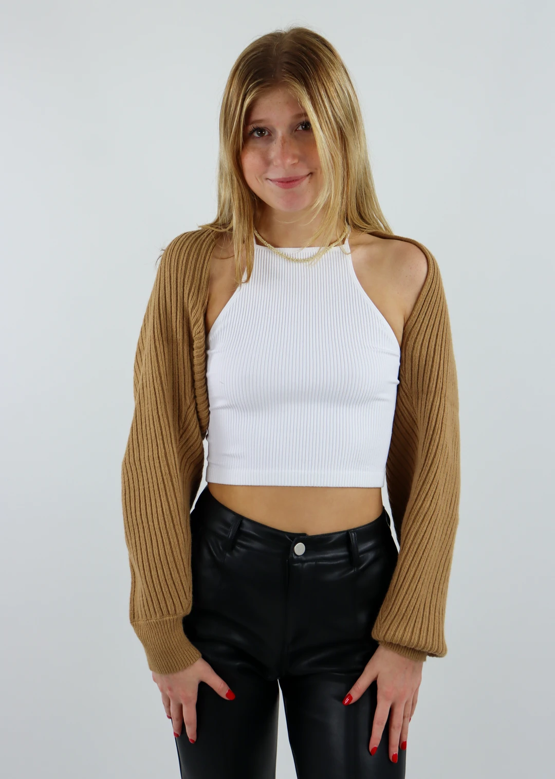 You are going to be living in this cropped shrug! The ribbed detailing and camel color are so perfect and make it necessary to add to your wardrobe. Definitely pair this shrug over your favorite seamless tank or a graphic tee for an edgier look!