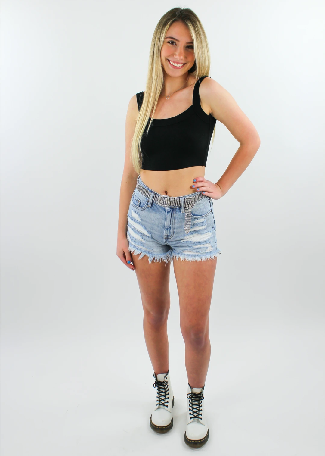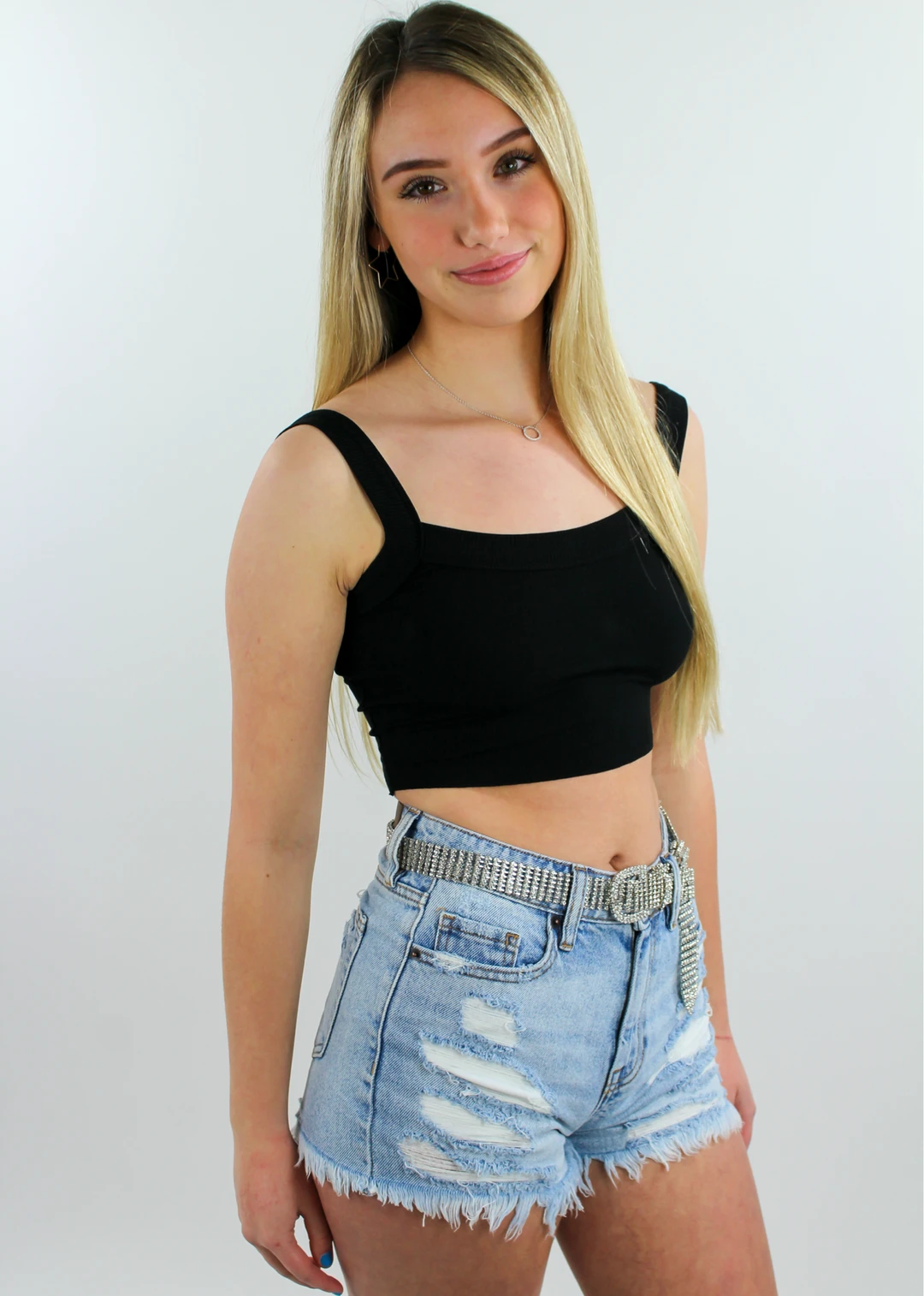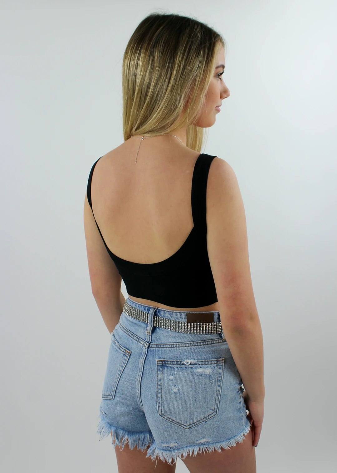 This crop top is a gorgeous basic. The neckline seams are super flattering and highlight your collarbones while the plunged back keeps it nice and open! Pair with your favorite pair of jean shorts or midi skirt.