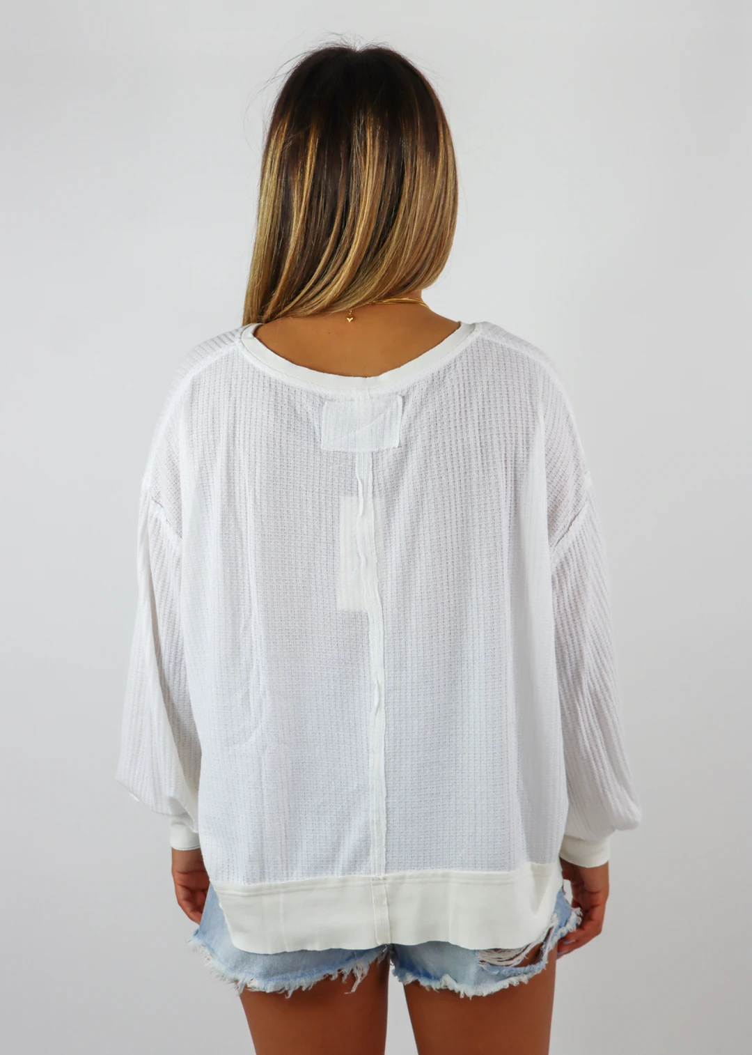 This waffle knit long sleeve top is the perfect basic to add to your closet! The combination of the notch neckline and slightly oversized fit is so flattering and we know it will look amazing on you. Style it with your favorite pair of jeans or denim shorts for an easy everyday outfit!