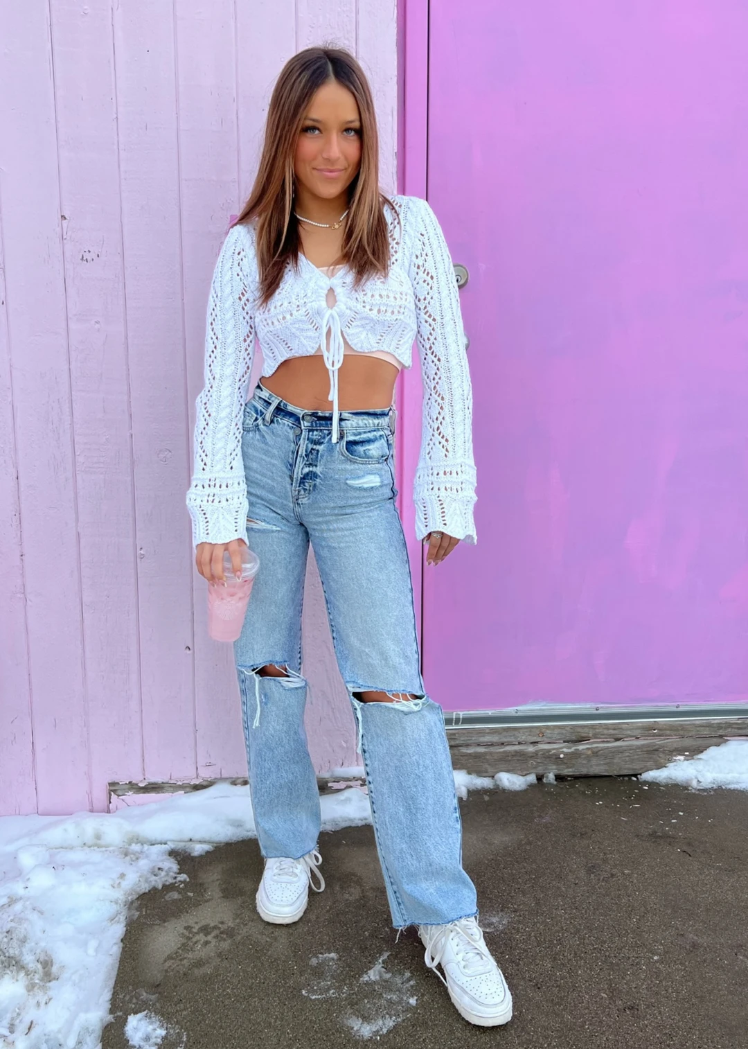 This white crochet top is going to be your newest obsession! It features a tie front with bell sleeves that is the perfect mix of cute and flirty. It is the perfect layering piece that you can wear all year round! Style this top with a basic white cami underneath with jeans and sneakers. We know you will rock it!