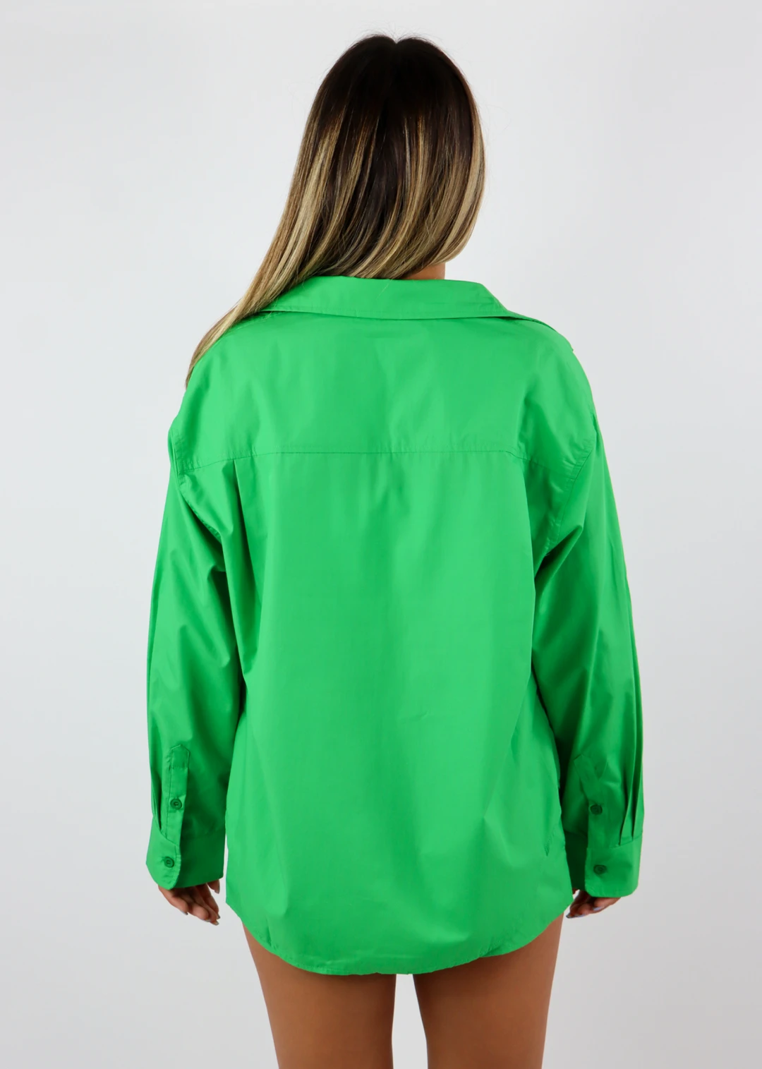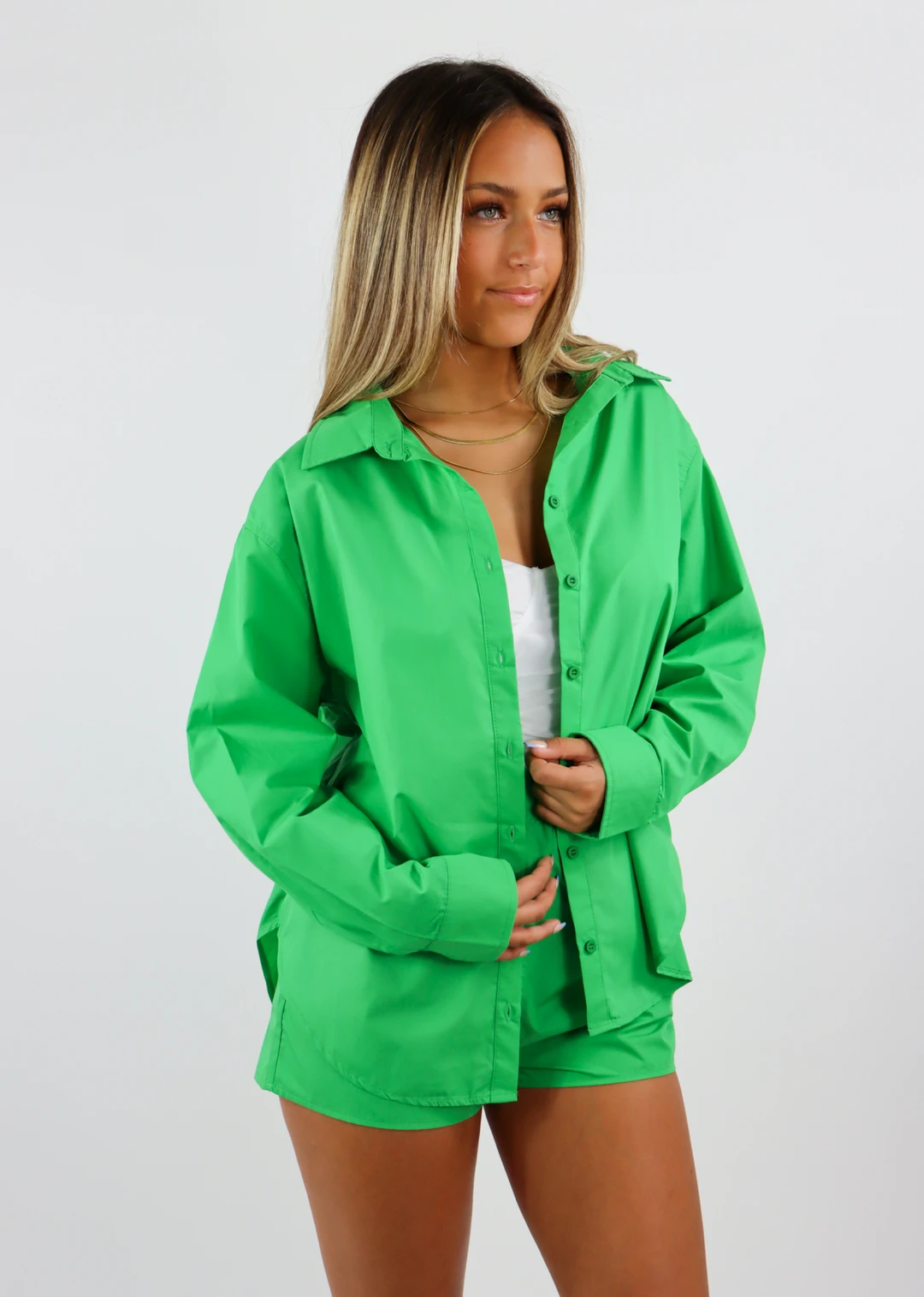 We are obsessed with this bright green button up top! The collared detailing and oversized fit make this the perfect layering piece. You absolutely need this top to make a statement in any outfit. Definitely pair this top with the matching bottoms to be the coolest girl in the room!