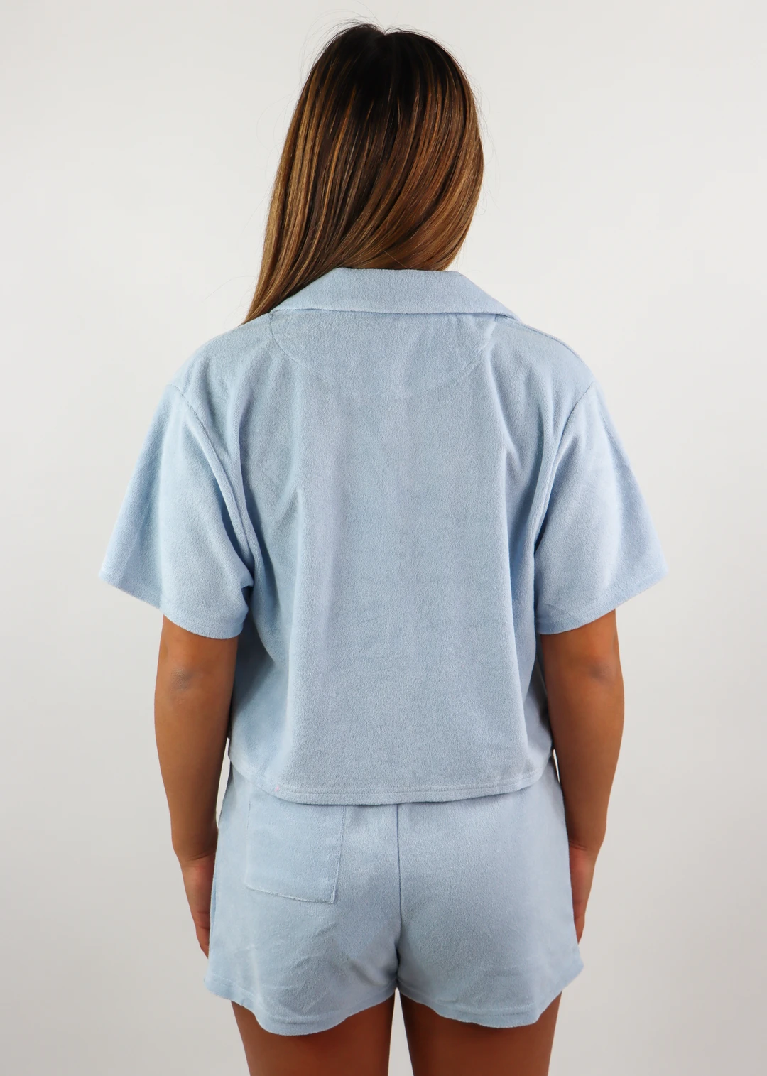 We are obsessed with this terry cloth button down top! This is the hottest trend for the spring and summer season that will keep you comfortable and looking cute. Style this with a white cami or your favorite bikini and complete the set with the matching shorts!