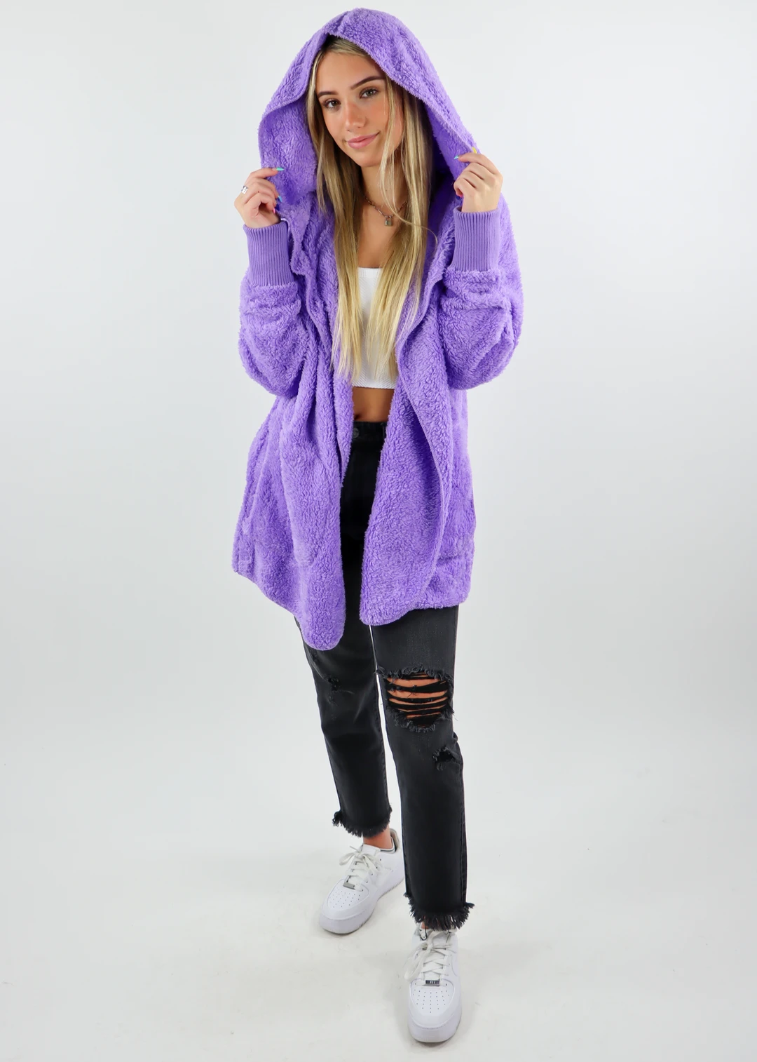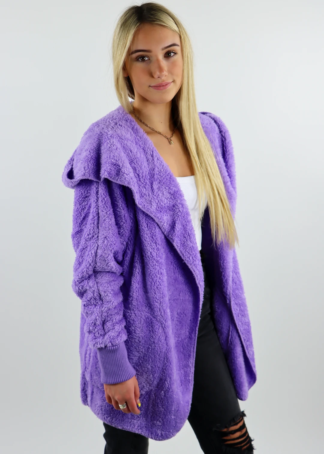 Warning: Once you put this fuzzy jacket on, you’re never going to want to take it off! This hooded cardigan jacket is soft and furry on both the outside AND inside for maximum comfort. It includes pockets on each side, a hood, and fitted knit sleeves at the wrist. One word: OBSESSED.