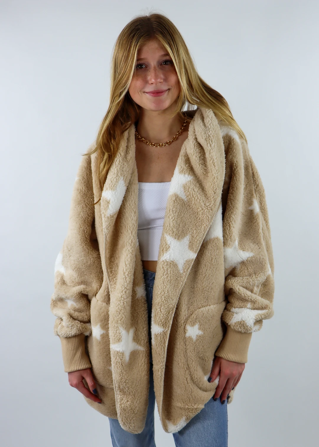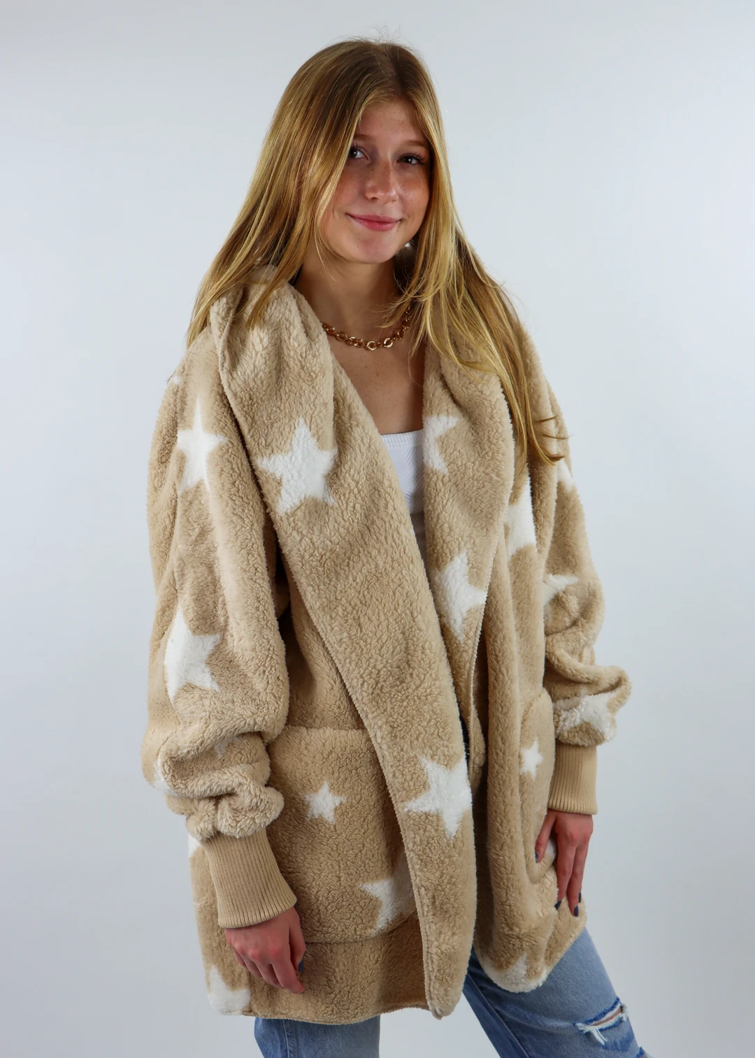 Warning: Once you put this fuzzy jacket on, you’re never going to want to take it off! This hooded cardigan jacket is soft and furry on both the outside AND inside for maximum comfort. It includes pockets on each side, a hood, and fitted knit sleeves at the wrist. Also, how could we not mention the adorable white stars throughout on a gorgeous tan-colored background? One word: OBSESSED.