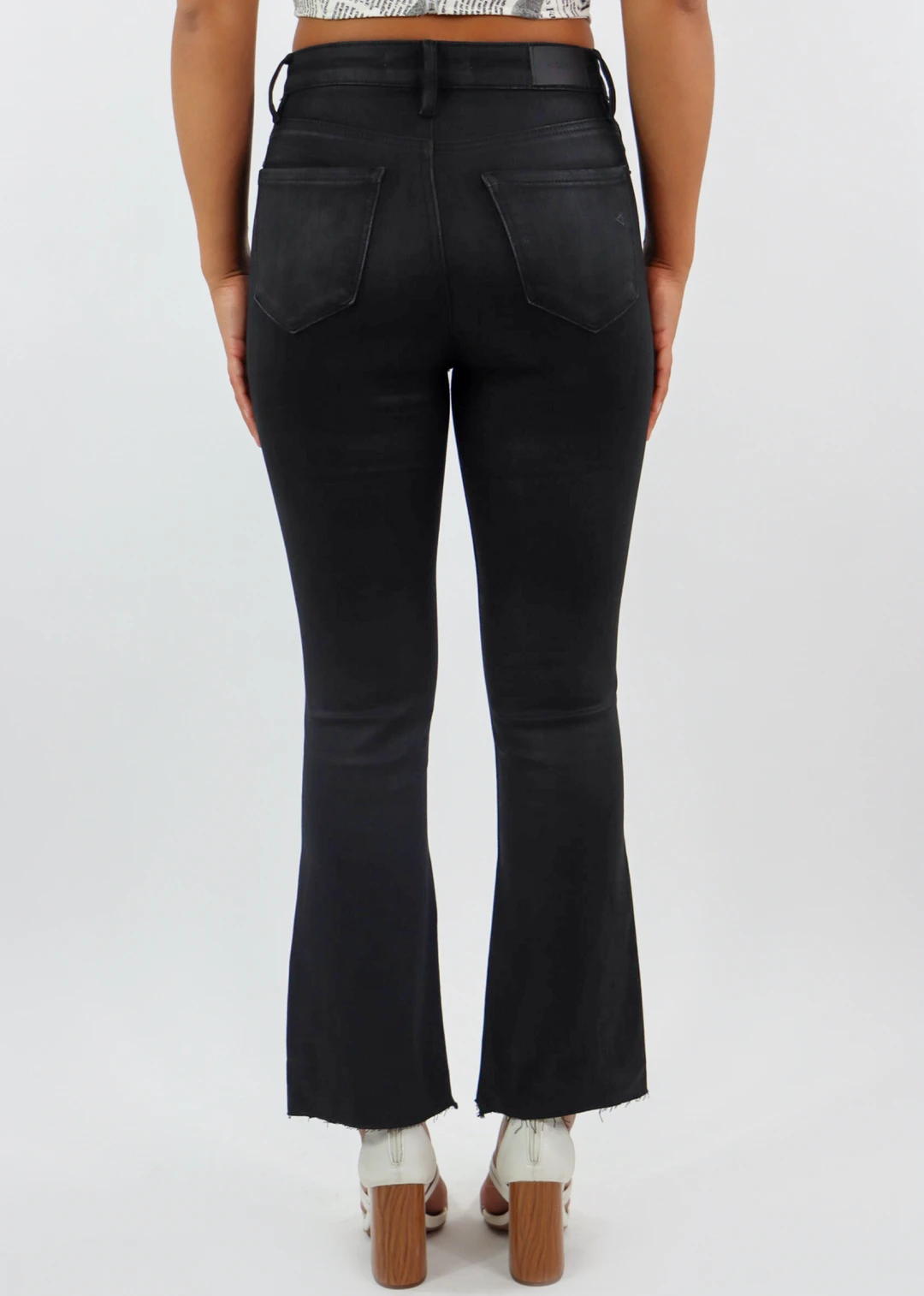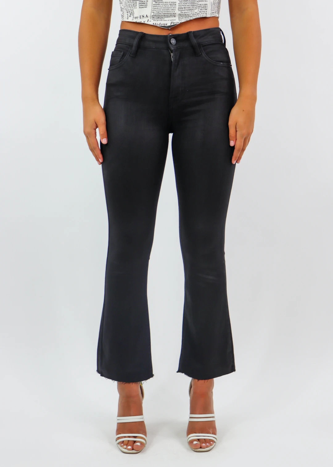 These black jeans are our newest obsession. They feature a high-waisted flare leg fit with no rips and a coated waxed material that are the perfect closet essential! These pants can be styled with any top and is perfect for any occasion. Pair these jeans with a tank or a sweater! These are perfect for year-round and we know you will rock it!