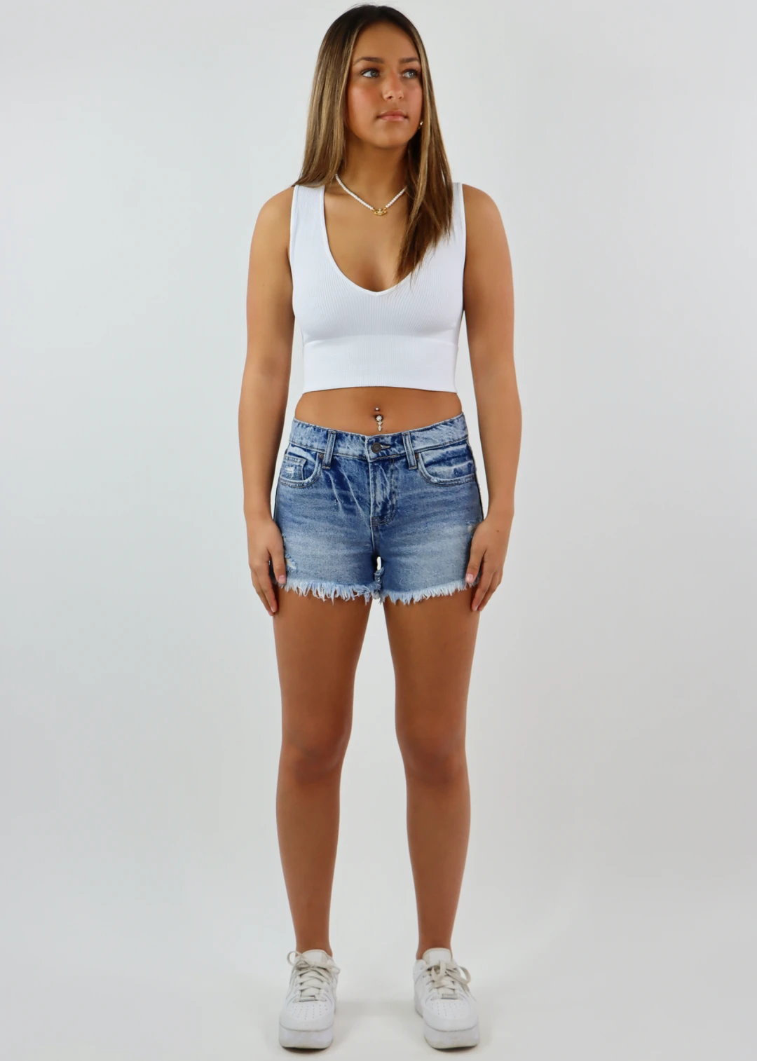 These dark wash jean shorts are a must have for those warmer days! They feature slight distressing throughout along with a frayed hem. The midrise fit is super flattering yet still comfortable. We promise that you won’t want to take these off!