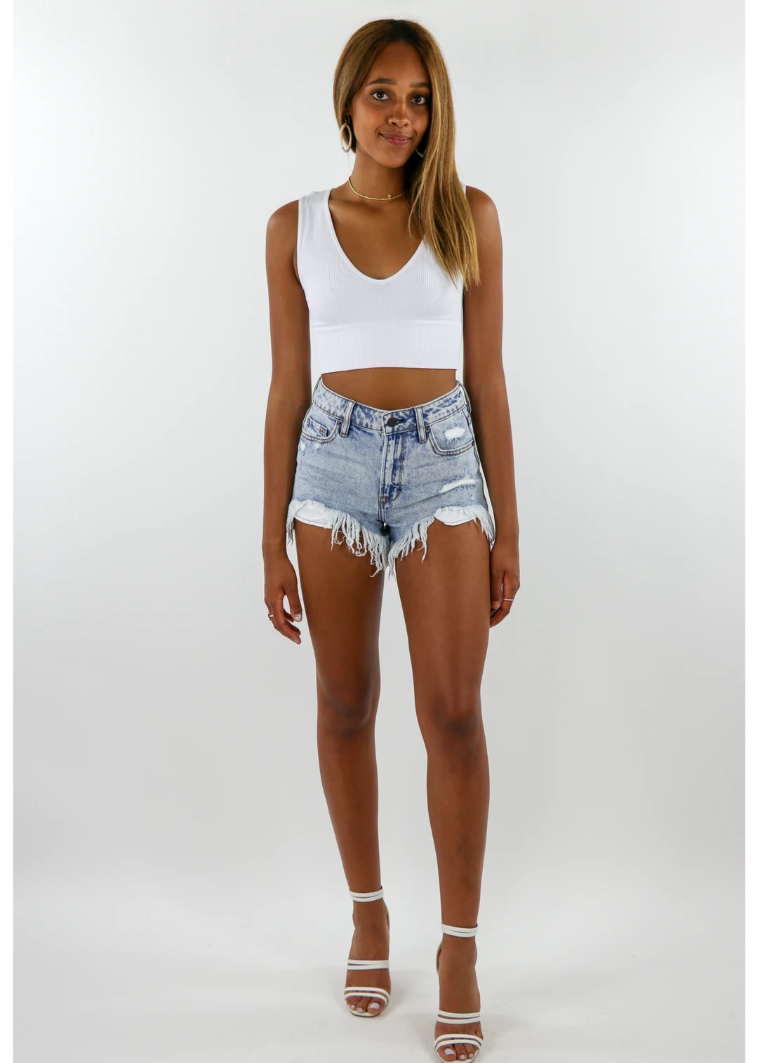 These classic mid-rise cut off denim shorts will quickly become an essential in your wardrobe. With the distressed feel and comfy material, you will not want to take these off.