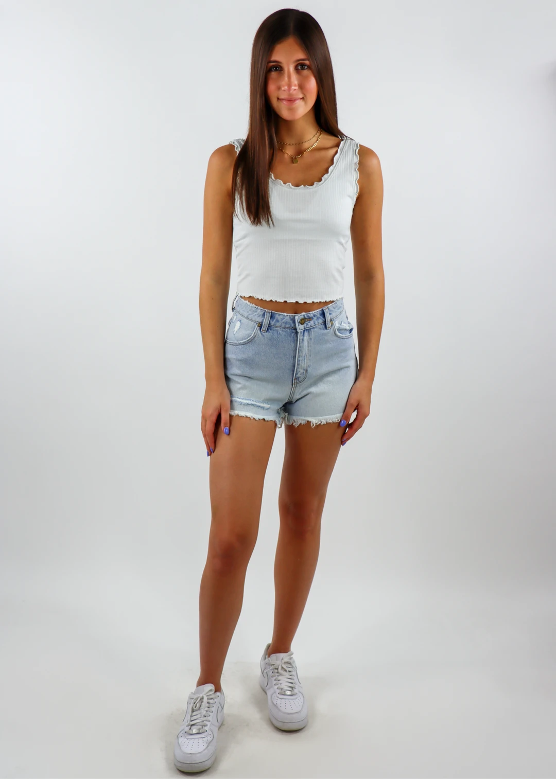 This heather grey crop tank top is a must-have! It features lettuce-edge trim and ribbed material that adds a perfect trendy twist to this basic piece. We love the versatility and comfort!