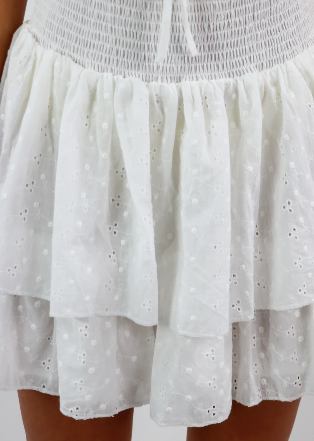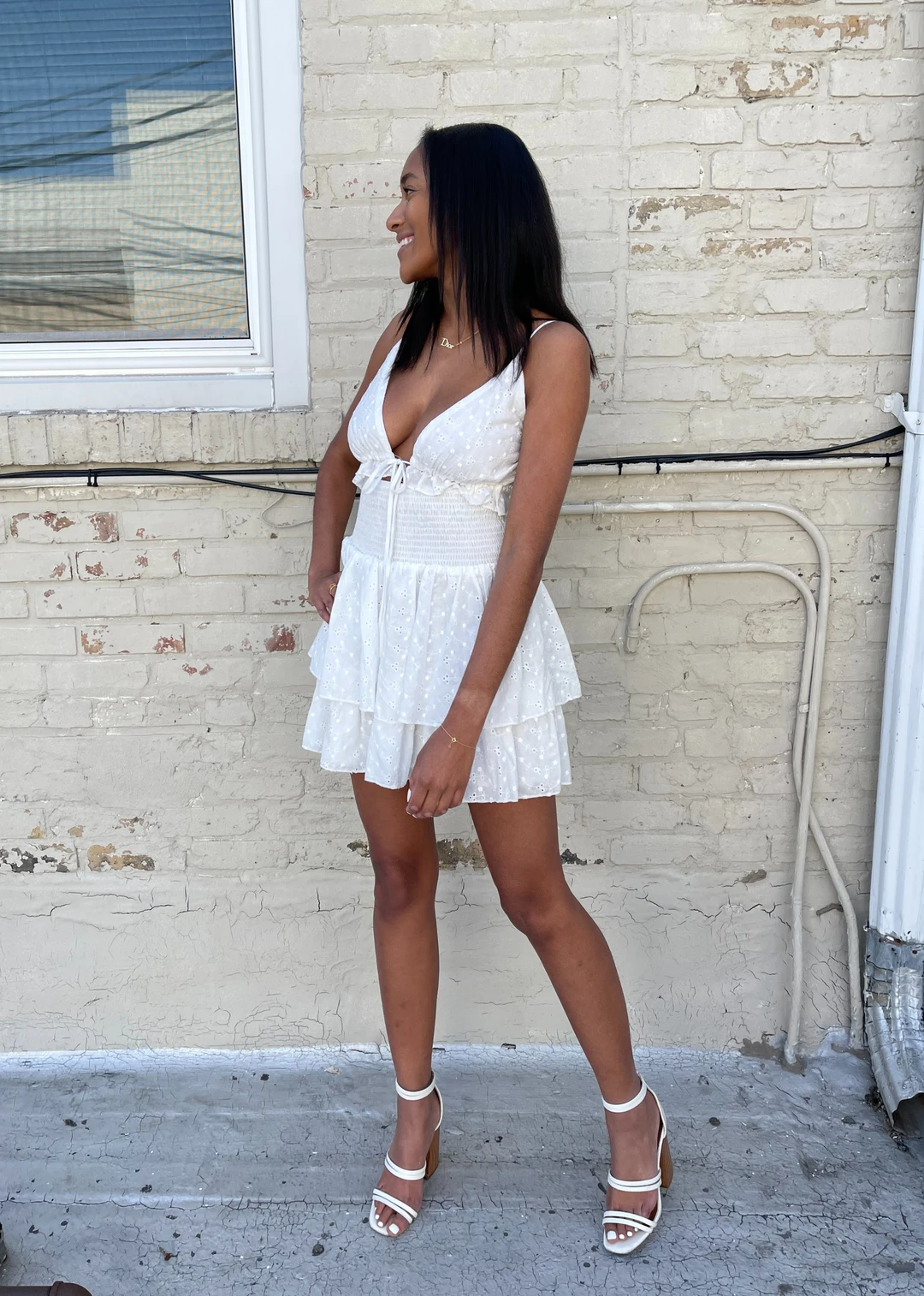 We are loving this White eyelet lace dress, it is perfect for those warmer days! It features a smocked waistband along with a two-tiered ruffle skirt. The top also has an adjustable bow tie detail covered by a ruffle under the bustline. This dress is the perfect mix of flirty and sweet!