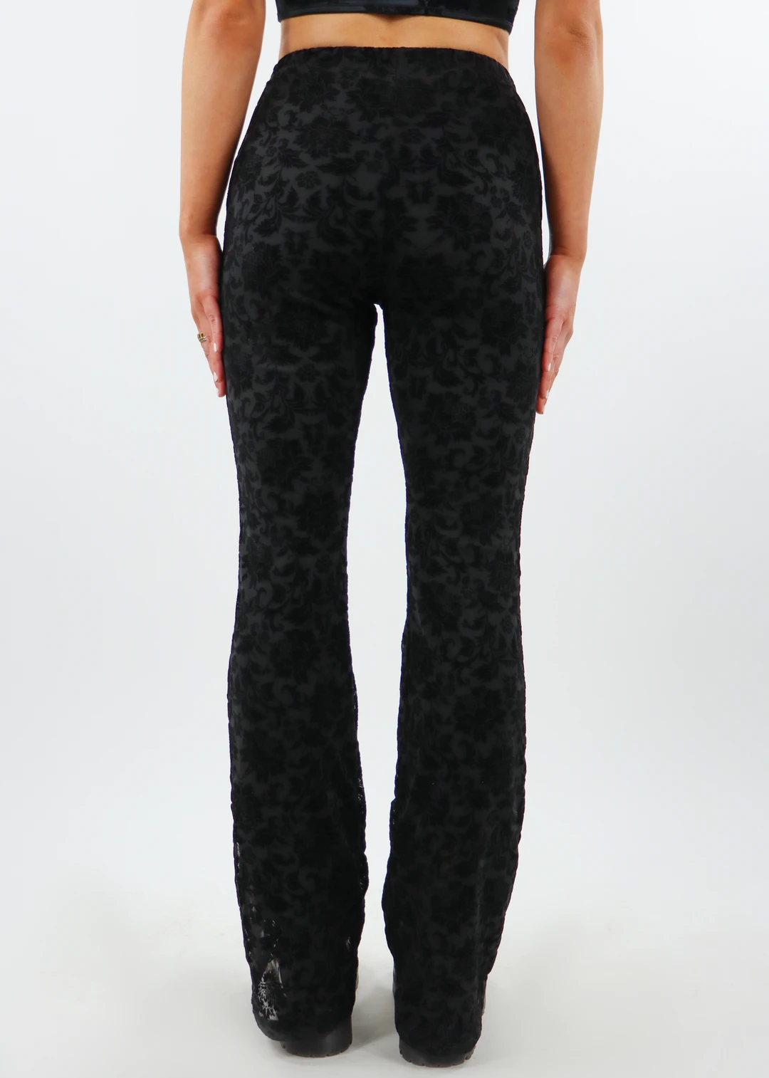 We are obsessed with these flare pants! They have a black base with a velvet rose detailing. The waistband is elastic making these pants a super comfy fit. Complete the look with the Black Rose Corset Top ★ Black!