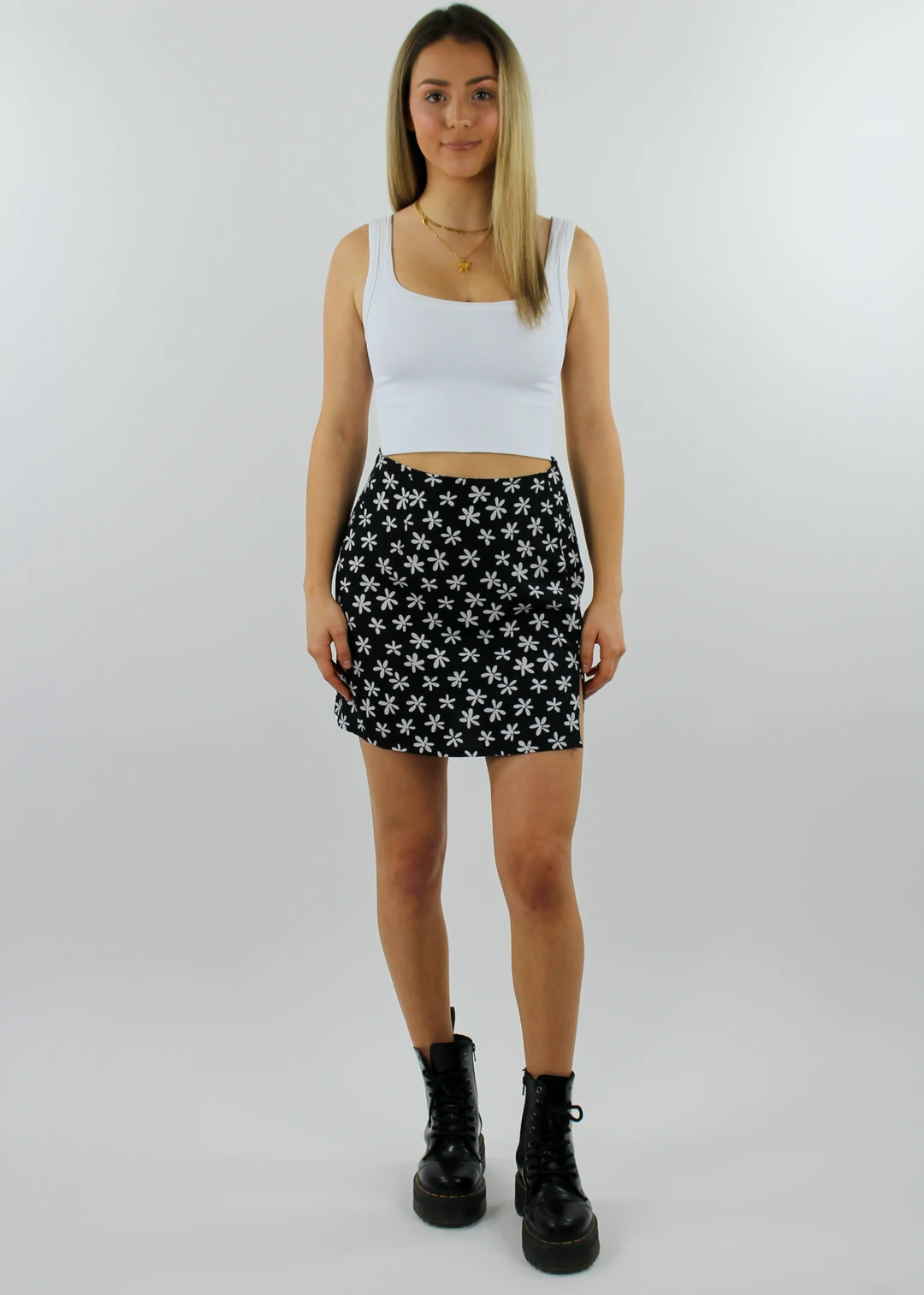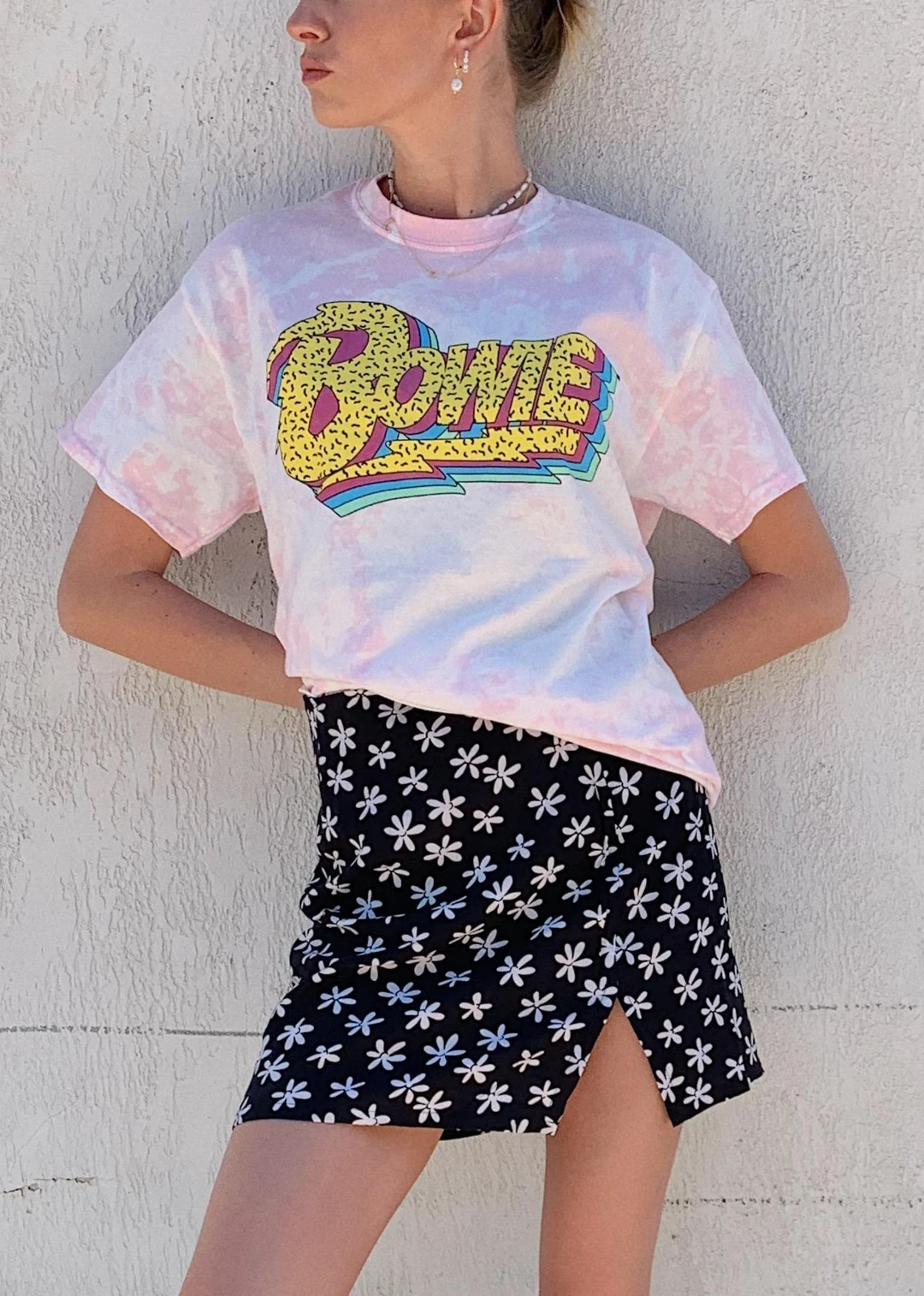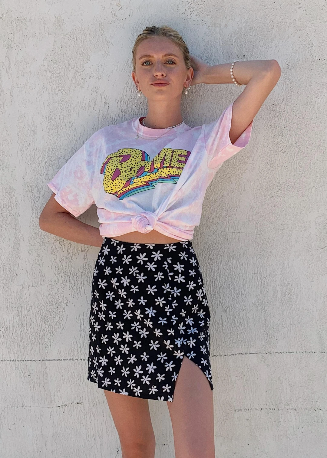 Daisy print is the IT print for this season, and we are about it. This Black and White Daisy Slit Mini Skirt features our favorite little side slit and making it the perfect summer skirt. Don’t forget to style it with some gold jewelry and a crop top to complete the look. Complete the look with the the David Bowie Graphic Tee ★ Pink Tie Dye or the Spill The Tea Tank ★ White.