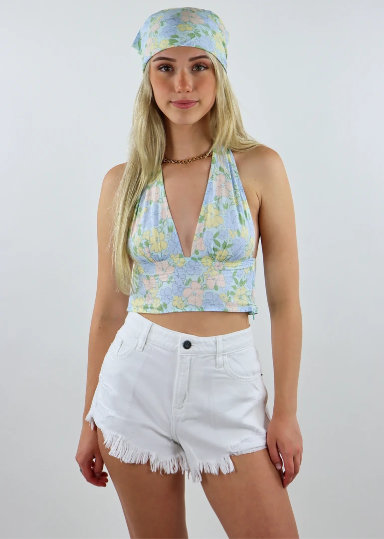 Bandanas have never looked so good…The Summer Bummer Bandana is the perfect accessory this festival season. This bandana features a pastel flower print and can be worn as a headpiece, scarf, tie-around for your purse, and so many other creative ways! Complete the look with the Summer Bummer Halter Top ★ Baby Blue for the cutest outfit.