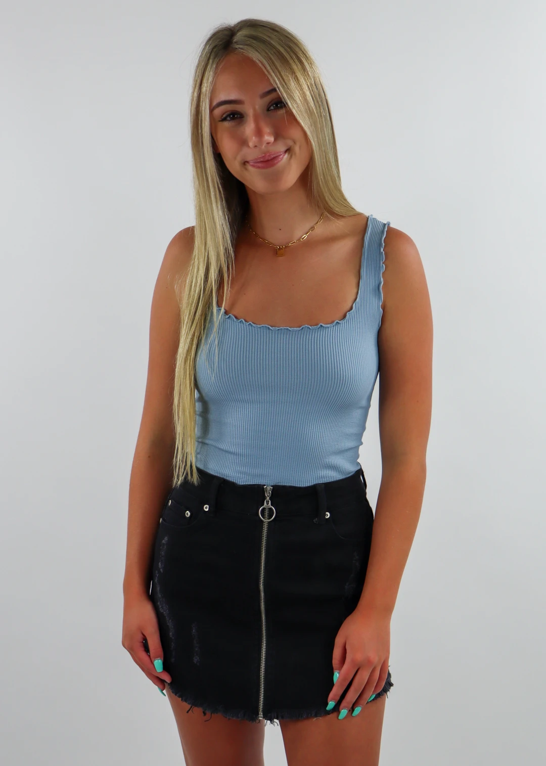This cropped tank is the perfect crop with a little flare! It’s great as a layer or you can wear it on its own! The lettuce edge with the scoop neck is beyond flattering. A great essential! Complete the look with the Black Beatles Skirt ★ Black.