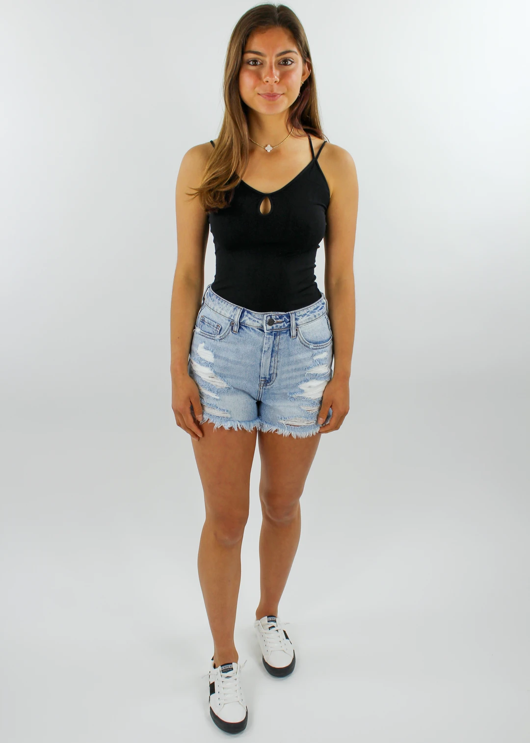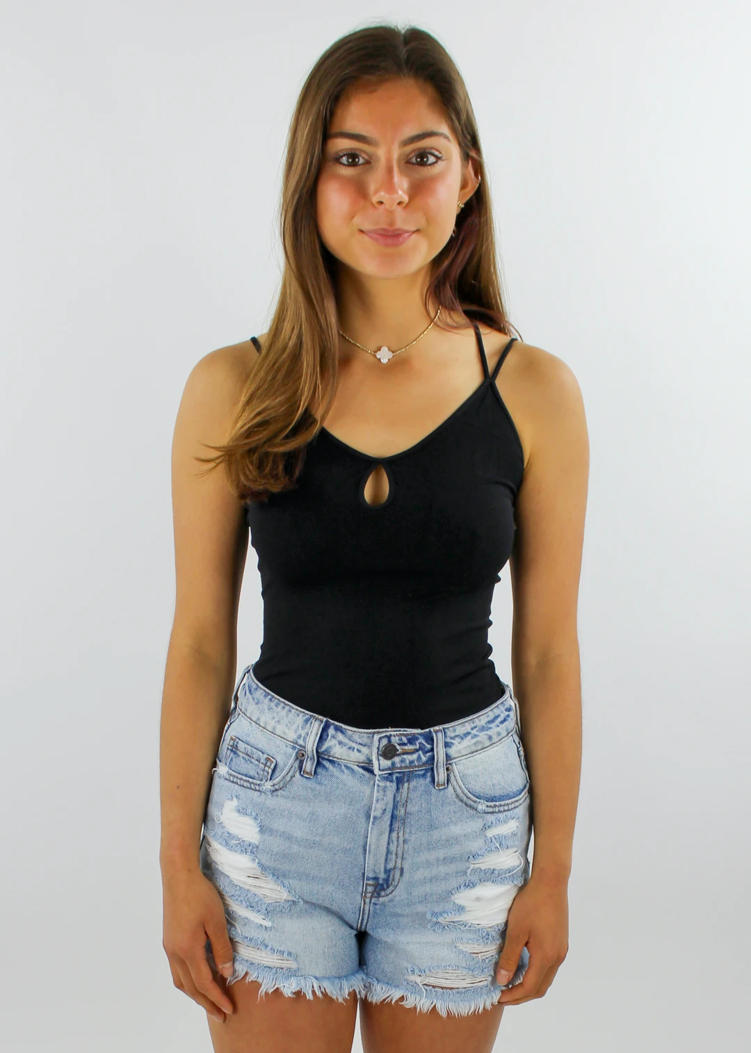 This cami has such unique straps and a keyhole detail. The back is layered with 3 straps to highlight your shoulders. The front keeps it nice and simple while adding a little detail for fun! Complete the look with the Tequila Sunrise Shorts ★ Light Denim. It also comes in White!