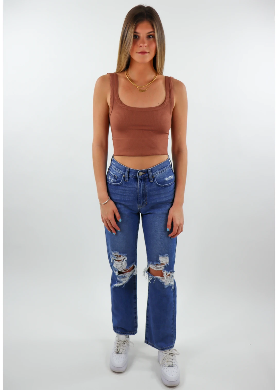 Spill The Tea Babe! This ribbed knit scoop neck crop tank is the perfect essential for your everyday outfits. Featuring a subtle chevron texture and the most amazing stretchy yet supportive material, this tank will have you feeling cool and confident.