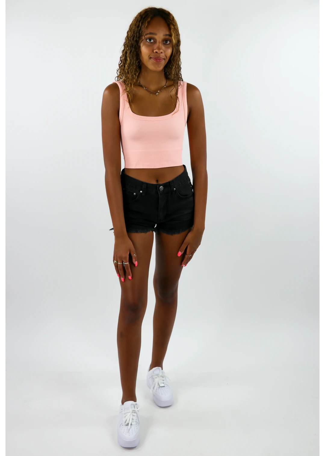 Spill The Tea Babe! This ribbed knit scoop neck crop tank is the perfect essential for your everyday outfits. Featuring a subtle chevron texture and the most amazing stretchy yet supportive material, this tank will have you feeling cool and confident.