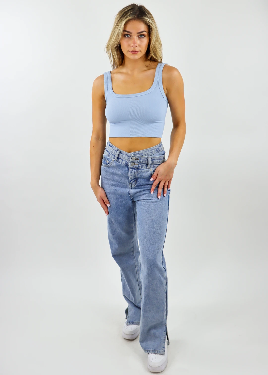 Spill The Tea Babe! This ribbed knit scoop neck crop tank is the best essential for your everyday outfits. Featuring a subtle chevron texture and the most amazing stretchy yet supportive material, this tank will have you feeling cool and confident.