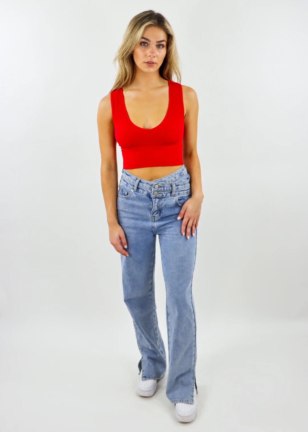 Whether it’s your throw on basic top or a stylish cropped workout tank, this is our favorite best-selling tank that we can’t keep it stock! Complete the look with the a pair of our best selling jeans.