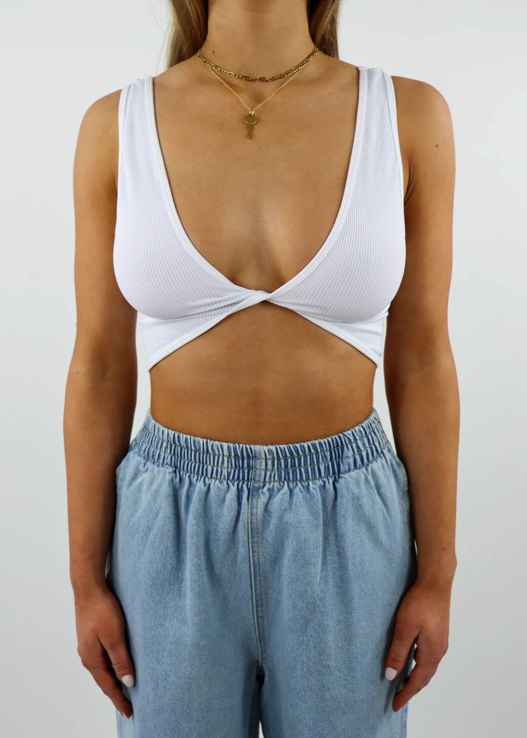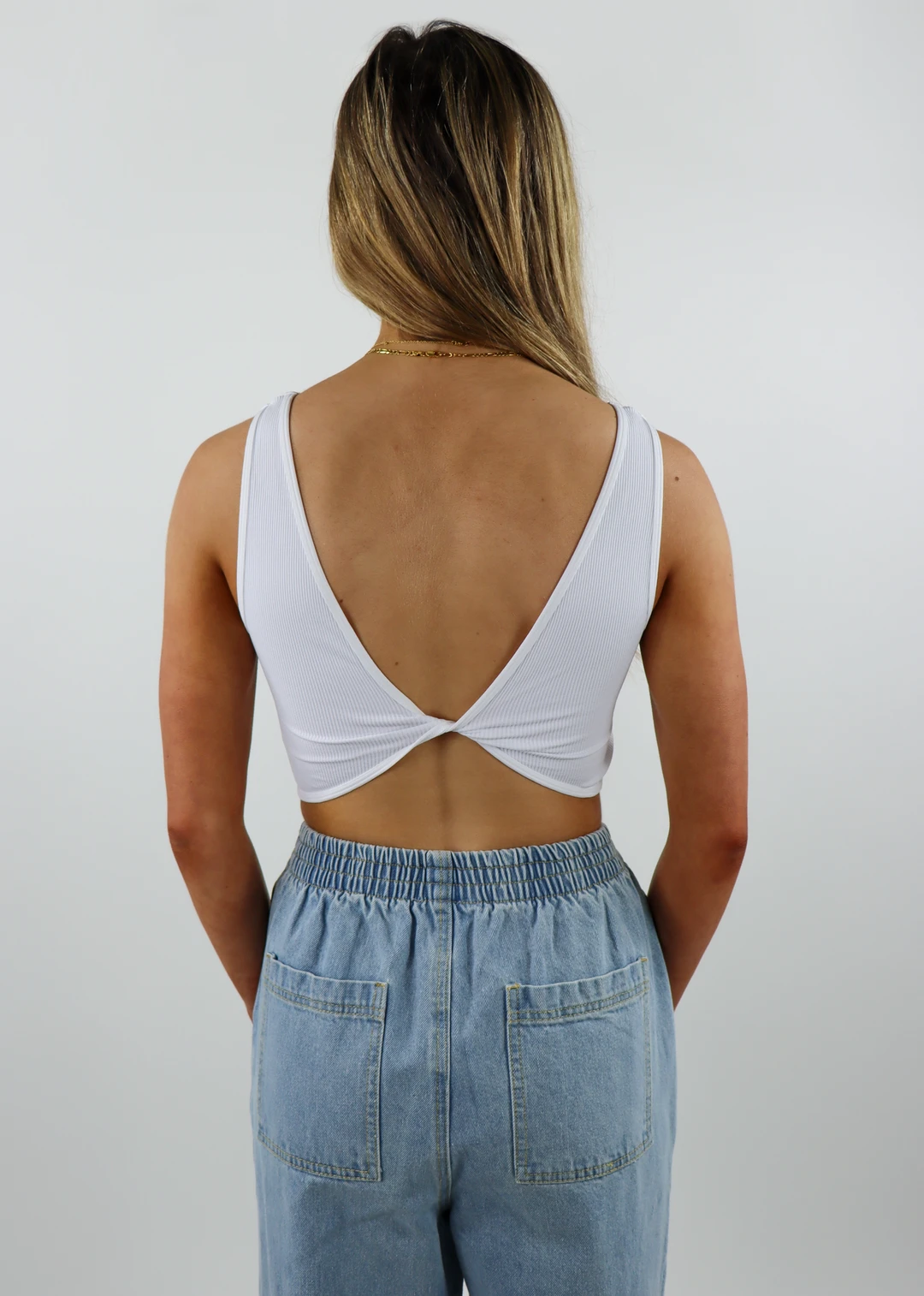 This white crop tank top is a must have! It features a twisted detail that can be worn on either the front or the back. We love the versatility and comfort! Complete the look with the As I Am wide Leg Denim Pants ★ Light Wash.