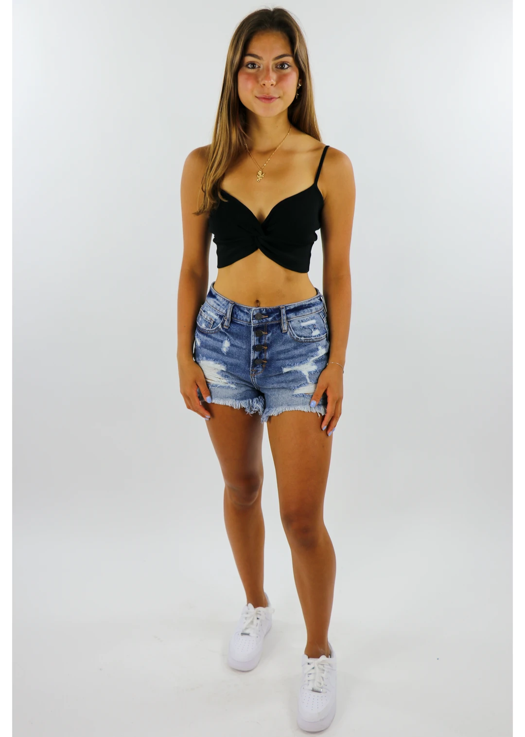 We are obsessed with this top. It is gorgeous, and it has adjustable straps! This cropped top is amazing with any bottoms, dressed up or down! Pair with jean shorts and a black belt and look unreal on your night out!