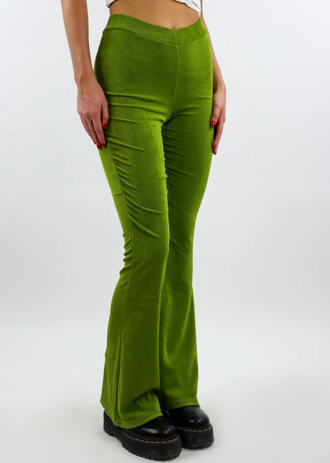 These groovy pants are everything you need and more! You will be the trendiest person in the room wearing these. These shimmer green pants feature a high waistline and a flared fit bottom. Complete the look with one of our best selling seamless tanks.