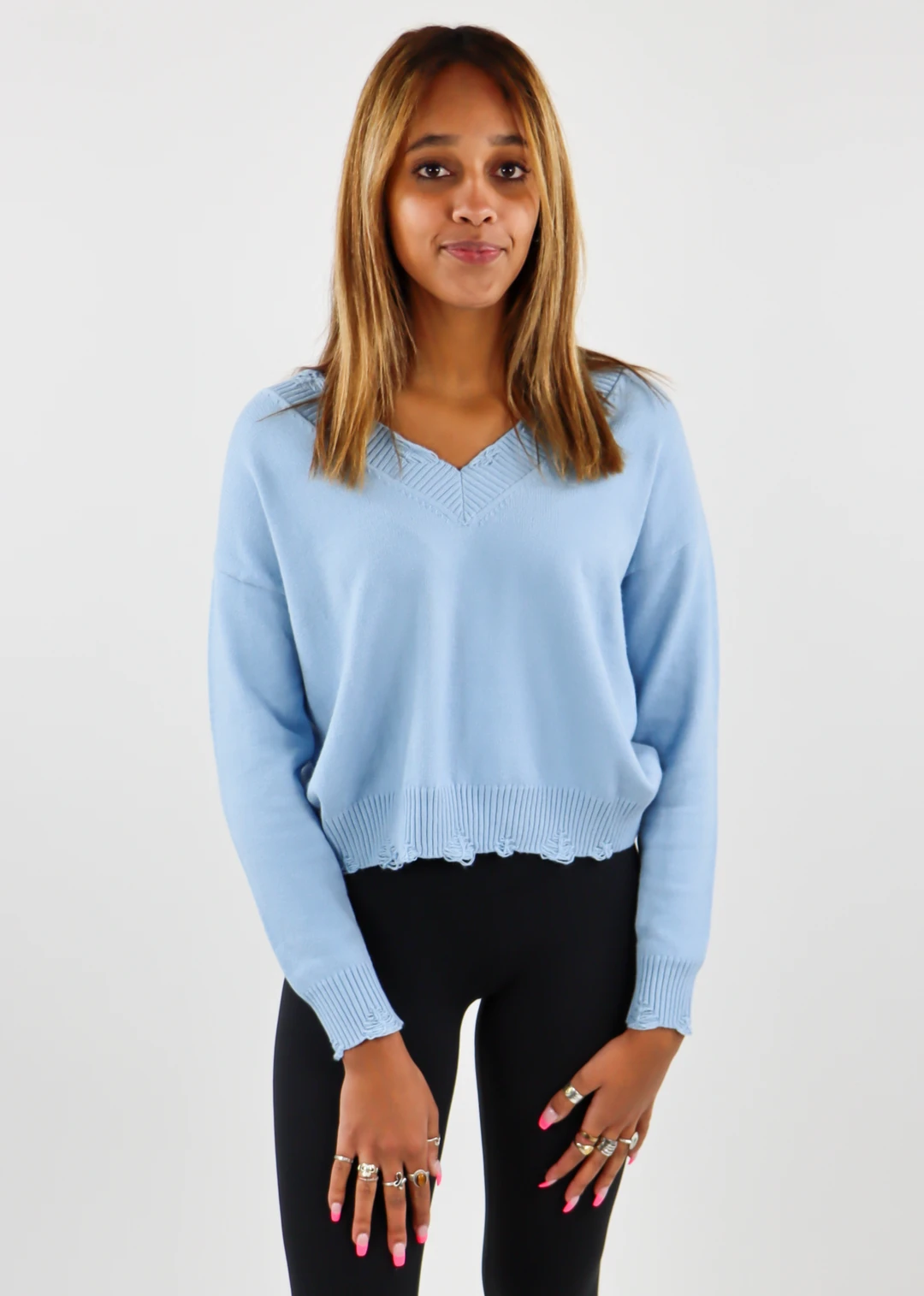 This baby blue distressed sweater is perfect if you’re looking to stay cozy and cute. The distressed hem and sleeves add a trendy twist on a perfect basic. Complete the look with a pair of our best selling jeans.