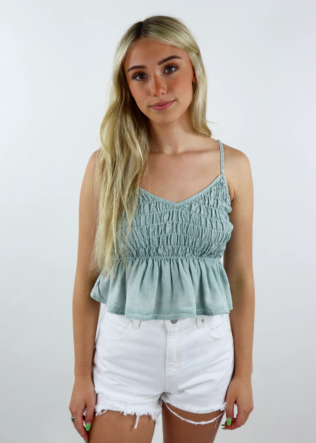 You are going to love this acid wash smocked tank top! It’s the perfect color for the summer and we know you would look amazing in it. It features a v-neckline which is so flattering along with smocked detailing so it’s very comfortable.