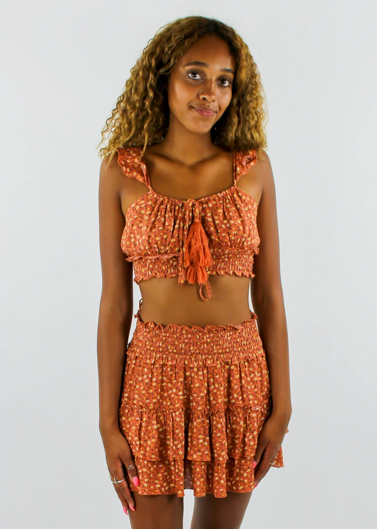We are loving this skirt and crop tank matching set! The floral pattern and tassel detail is so cute and flirty! This tank is cropped and has an adorable smocked hem. The sleeves are adjustable making this piece fit perfectly! Complete the look with the Start Me Up Skirt ★ Burnt Orange.