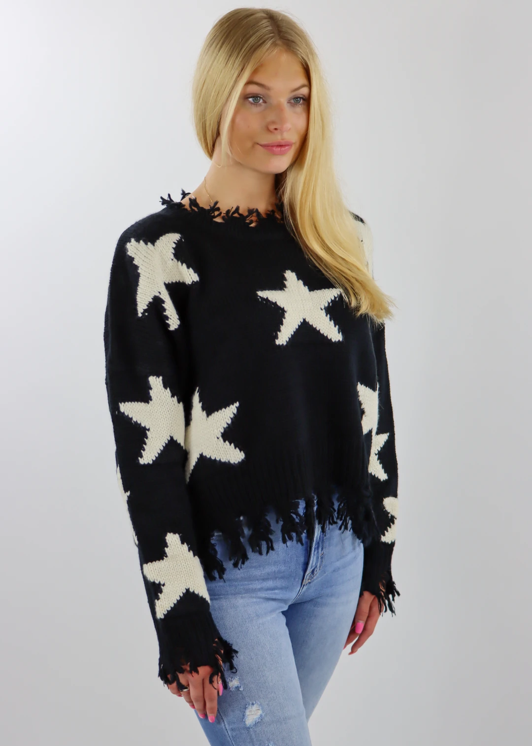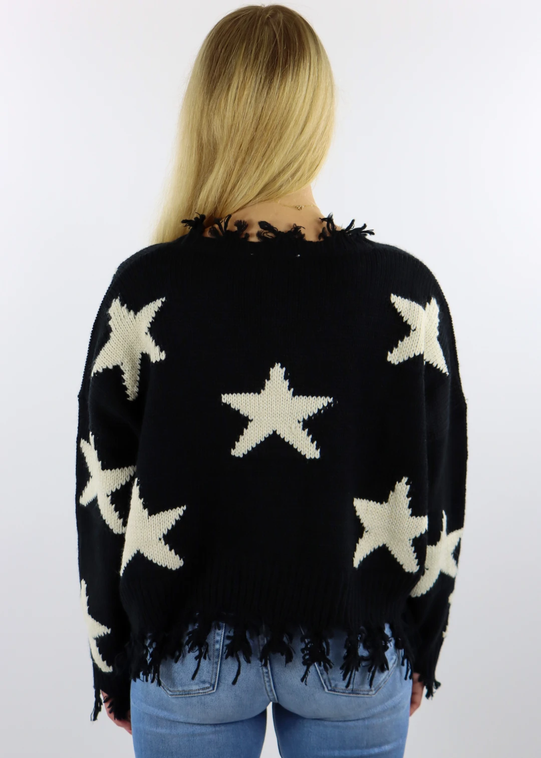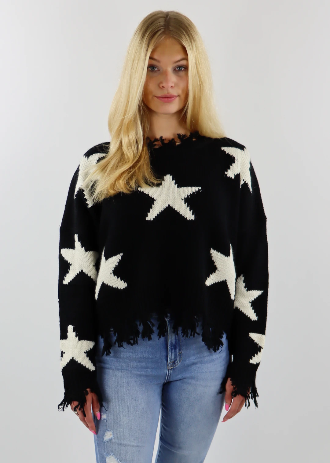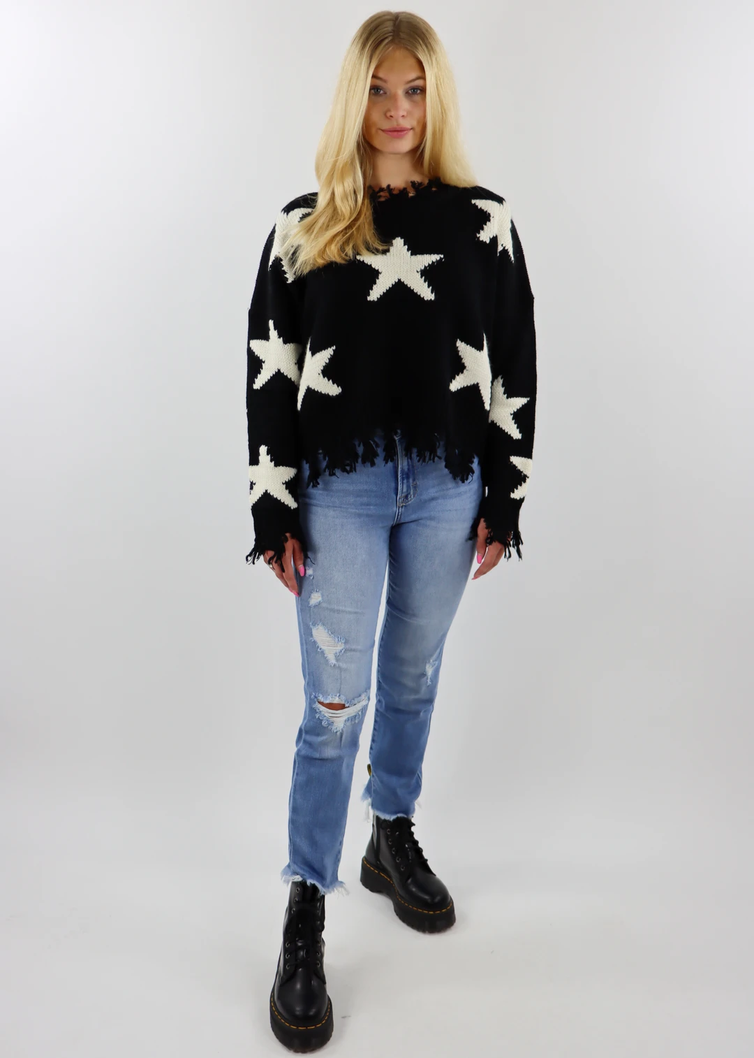 A comfortable and cute sweater is a closet essential. This black knit sweater features white stars and is frayed along the edges. These details will make you stand out and help elevate your outfit and wardrobe to trendy and fun! Pair the look with your favorite jeans and boots!