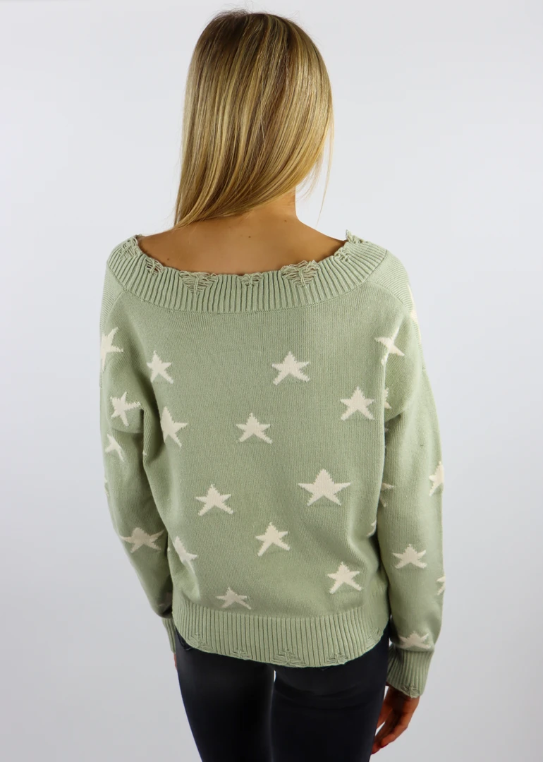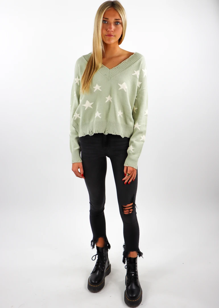 This Sage Green distressed sweater with Star Print is perfect if you’re looking to stay cozy and cute. The distressed hem and sleeves add a trendy twist on a perfect basic.