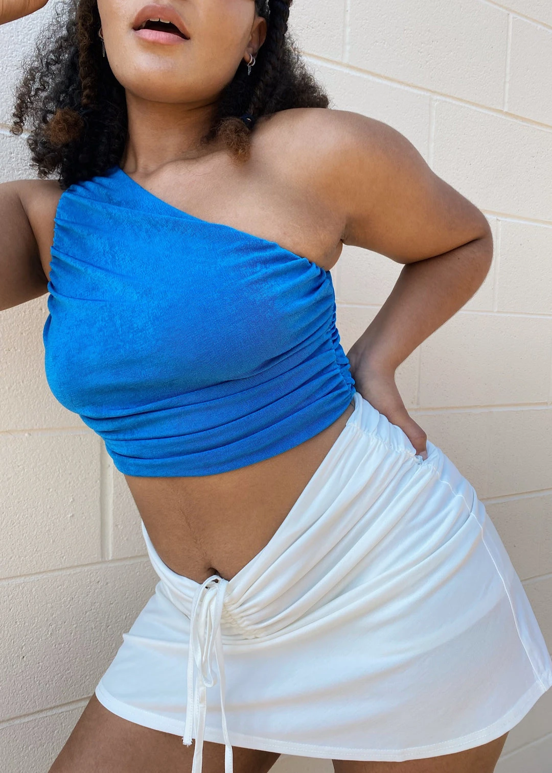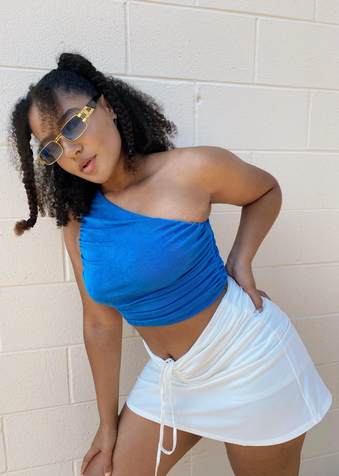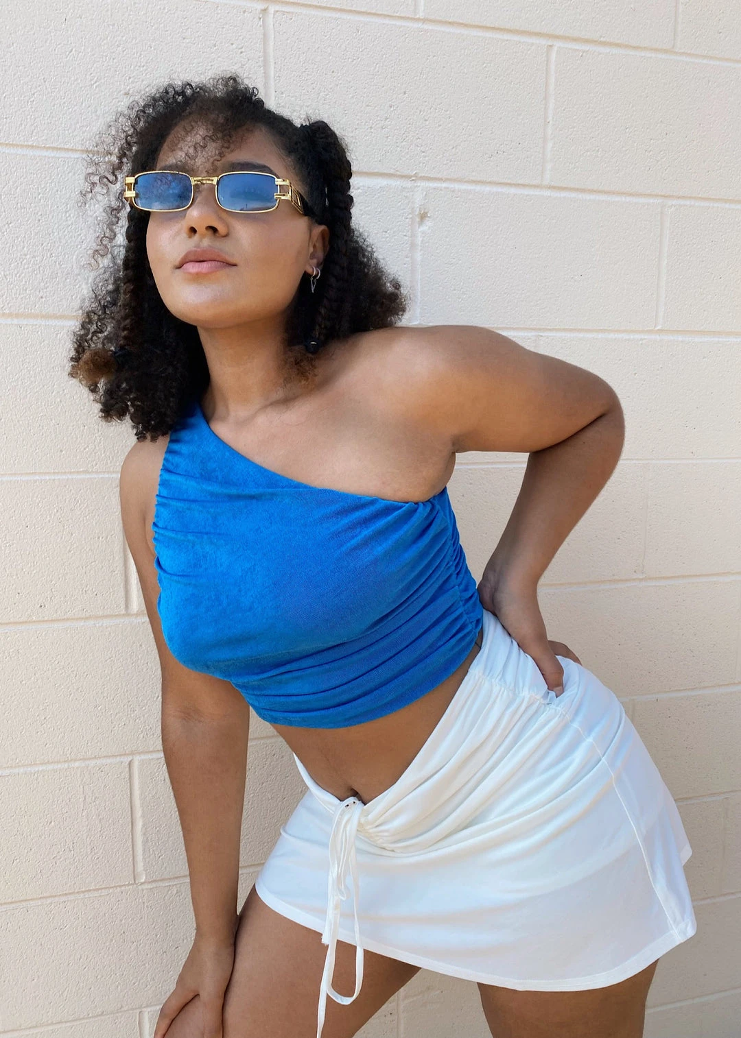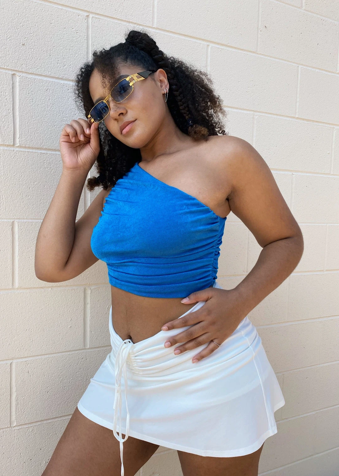 This ruched one shoulder top is screaming your name! It features a cropped fit and a shimmer blue material. Wear it to dinner with your family or out on the town with your friends and heads will turn for you.