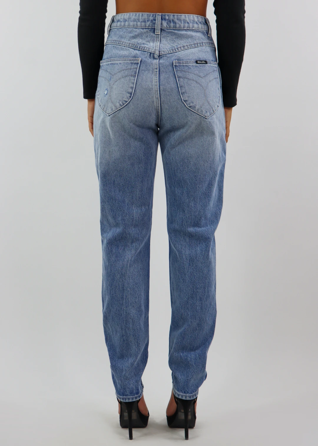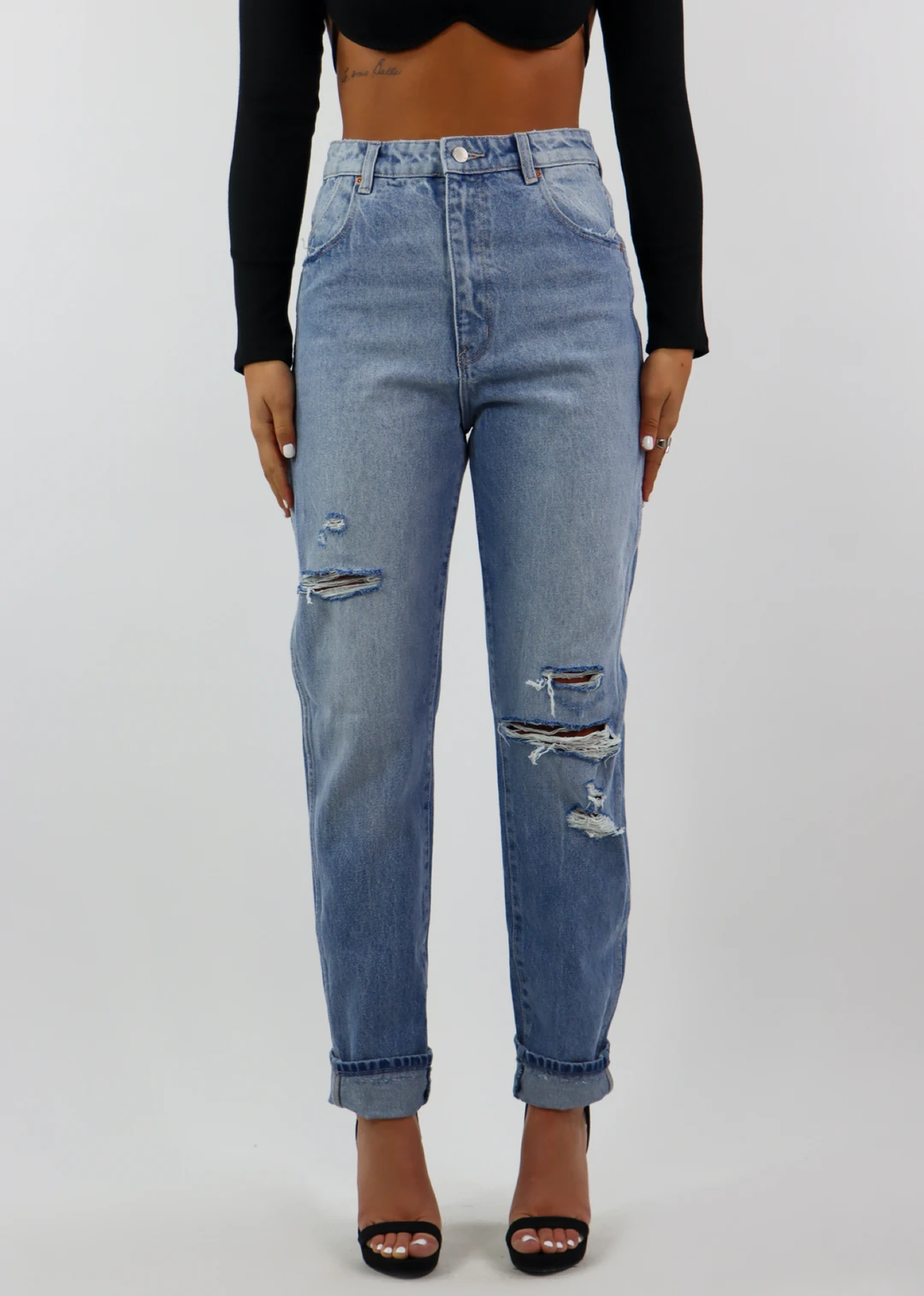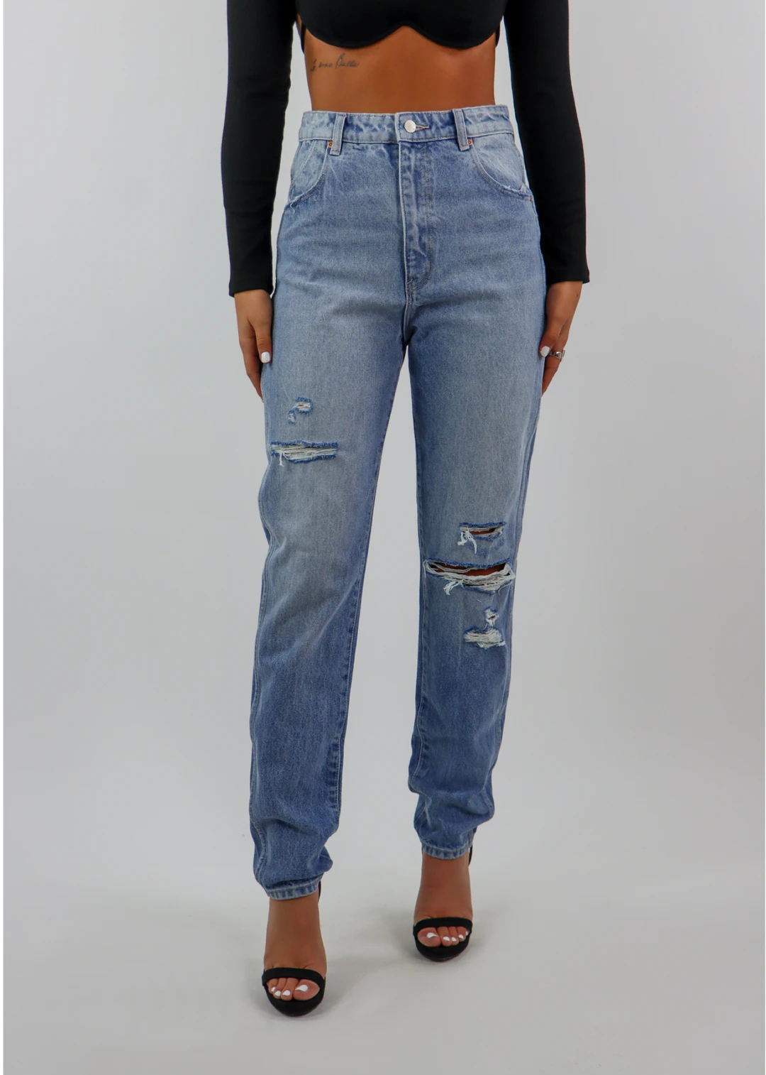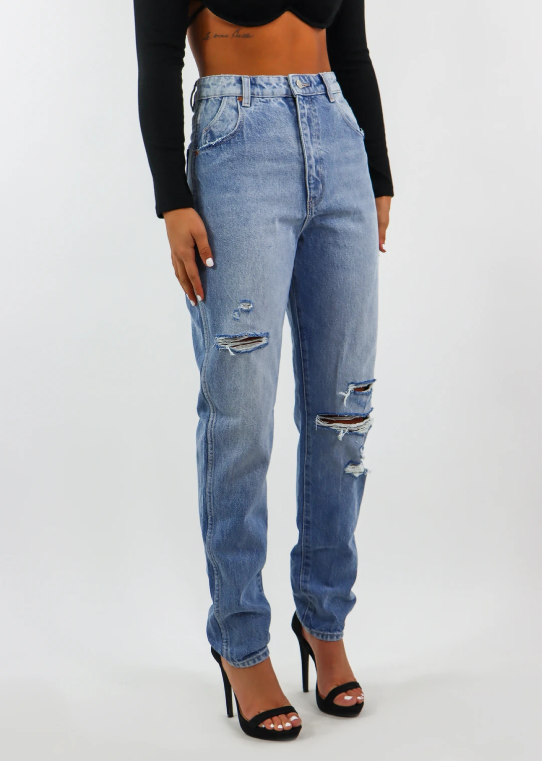 These high rise light wash baggy jeans are a must have! Not only are they comfy, they are so flattering. These boyfriend jeans feature distressing on each leg and have a zipper closure.