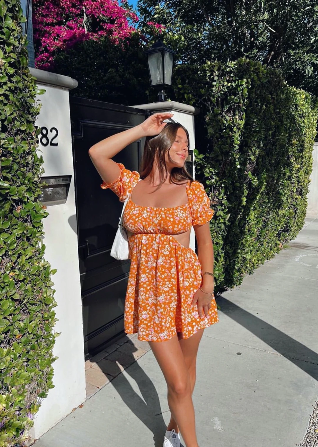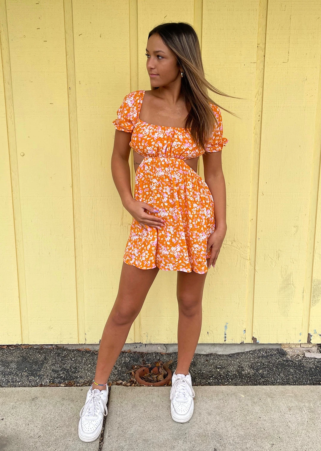 We are loving this orange floral dress! It features a puff sleeve as well as side cutouts making it so on trend. This dress is guaranteed to have you feel all the warm weather vibes!