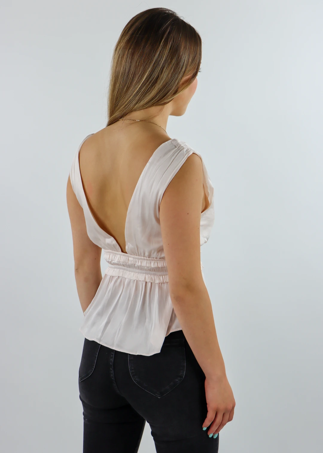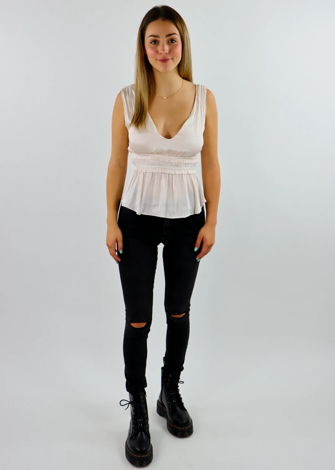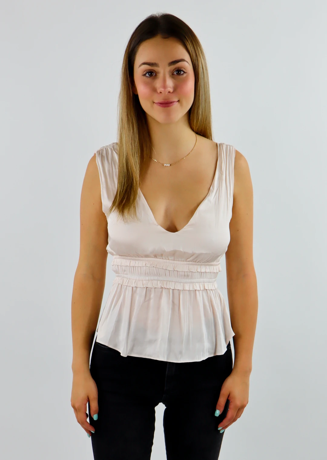 This silk tank top is the perfect top for a night out on the town! It’s ruched on the bottom and top with a deep v plunge in the front and the back. Complete the look with your favorite pair of dark wash jeans.