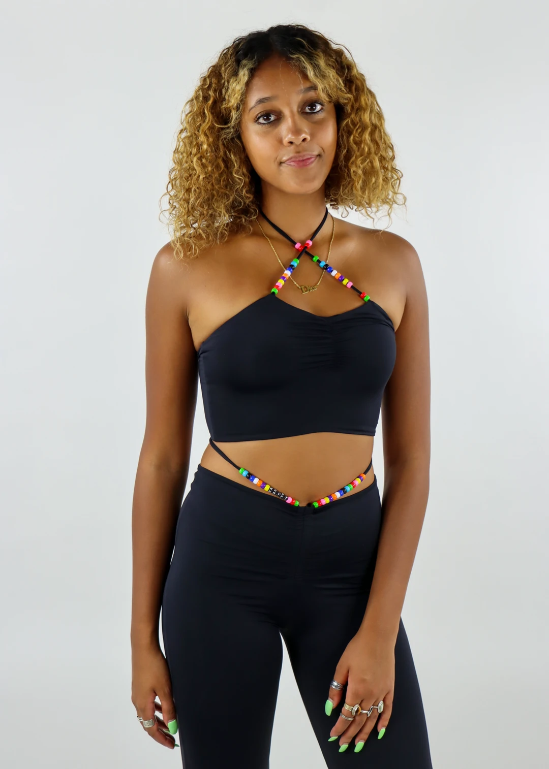Your new favorite top is finally here! This cute black crop top features beaded halter straps and a cinched front. You can wear it out with your friends or to your favorite festival.